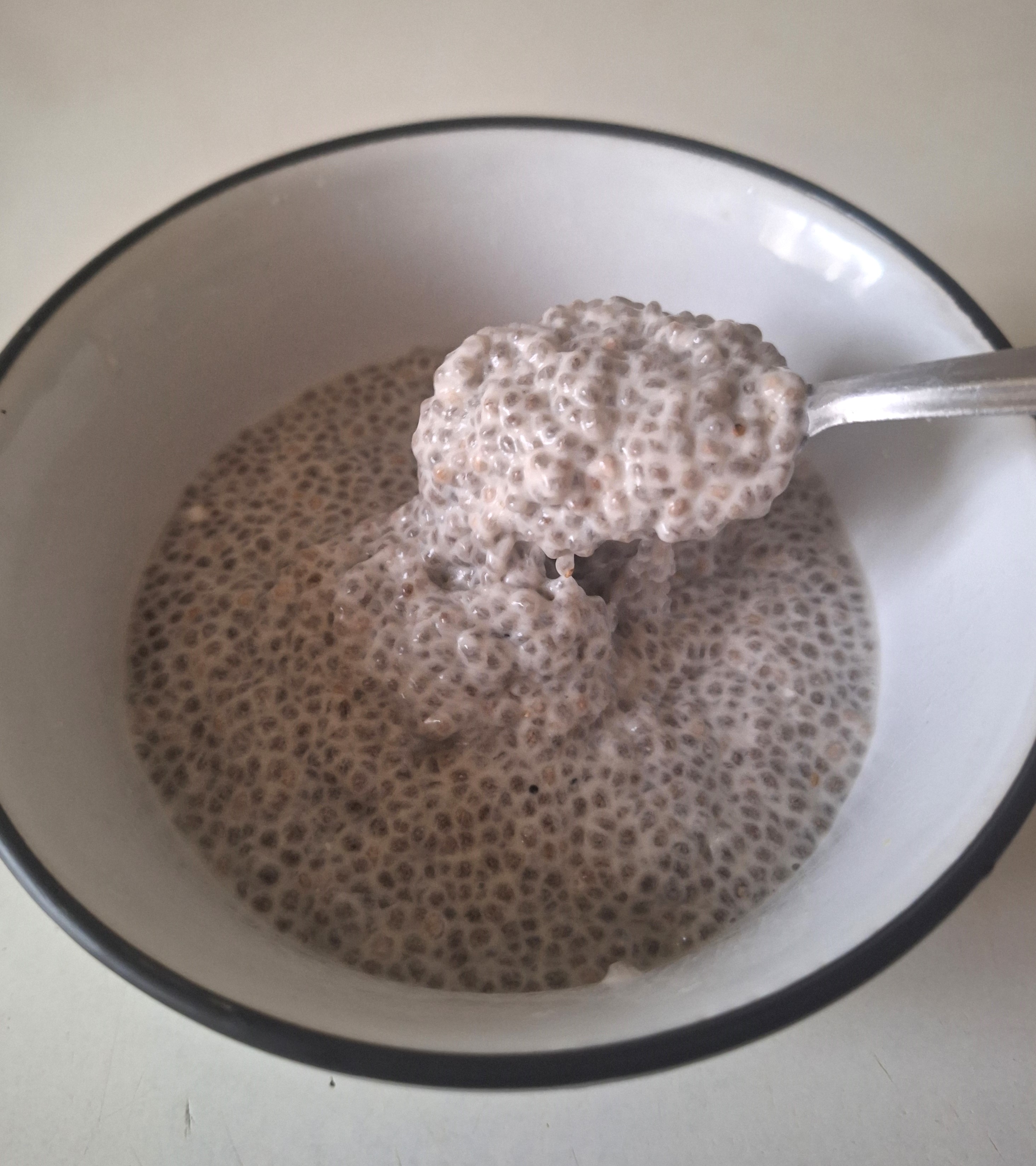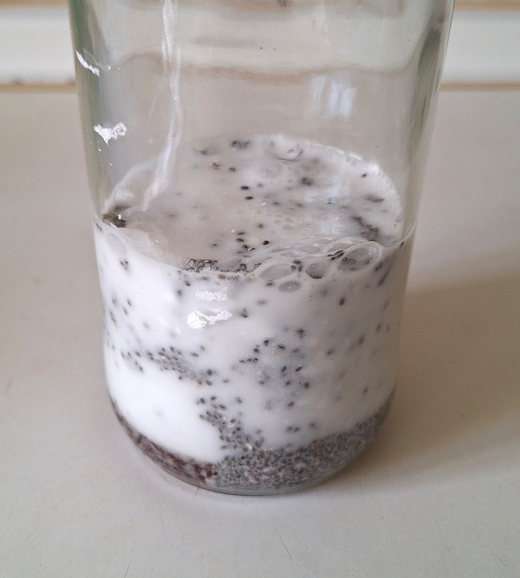 El otro día se me ocurrió la brillante idea de utilizar leche de coco (de lata) en lugar de bebida vegetal y di de lleno en el clavo. Suelo utilizar mucho este producto para currys, cremas y como relleno de tartas. Normalmente utilizo la parte sólida y el líquido sobrante lo congelo para otras elaboraciones. Y así fue… Había utilizado la parte sólida para hacer nata de coco montada y el resto del líquido, junto con lo poquito sólido que quedaba en los bordes de la lata, lo metí en un frasco de cristal y agité unos segundos. En un momento se había formado una especie de leche bastante cremosa y decidí añadirle la chía. No os podéis imaginar la textura tan estupenda que queda y el sabor tan delicioso que tenía este pudding.