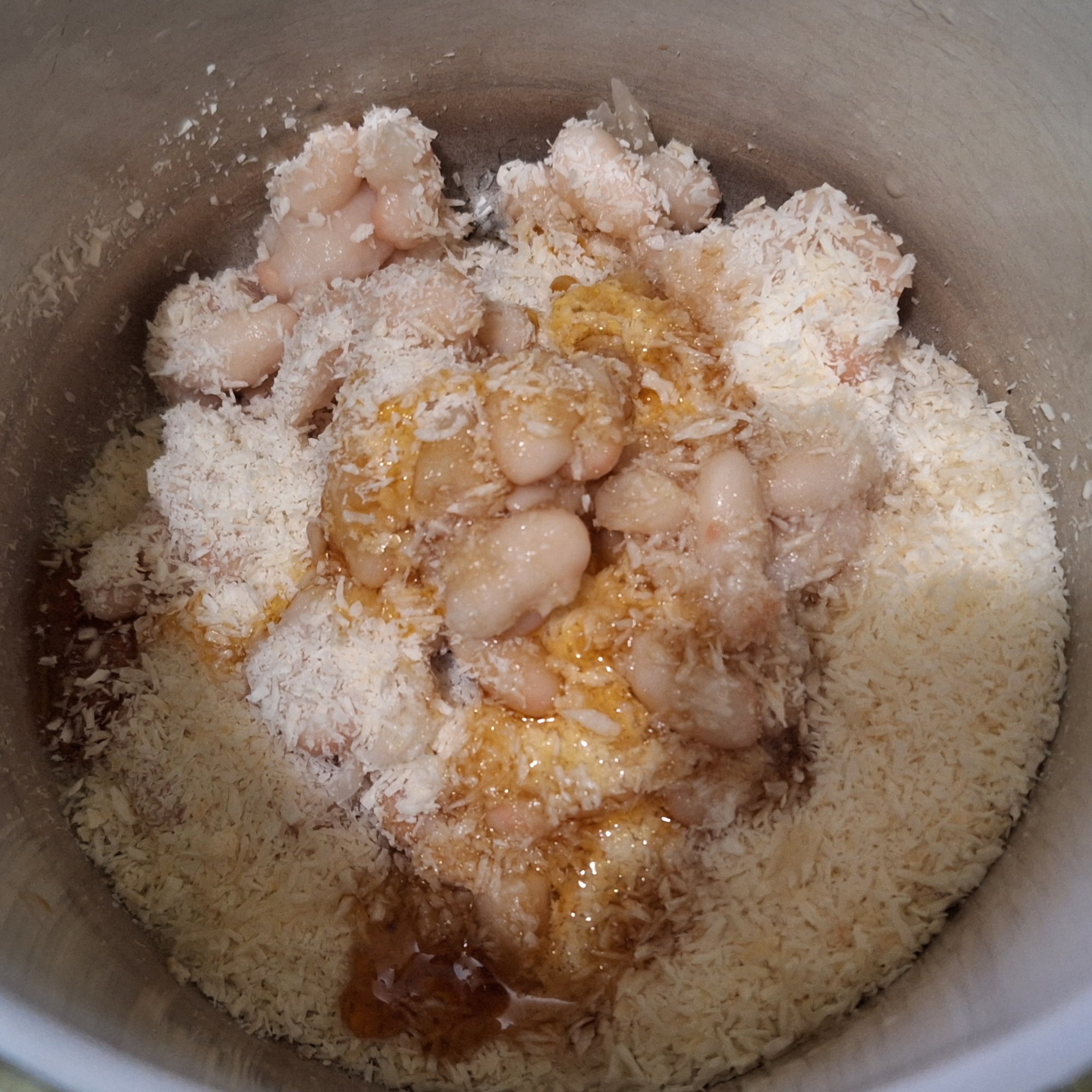 Aclara las alubias y escurre. Vierte en un recipiente grande junto con el resto de los ingredientes (salvo las avellanas) y tritura. Deja reposar unos 20 minutos para que el coco se hidrate. Debe quedar una masa manejable, ni muy densa ni muy blanda. Si está muy seca añade un poco más de sirope; si está muy blanda, añade más coco.