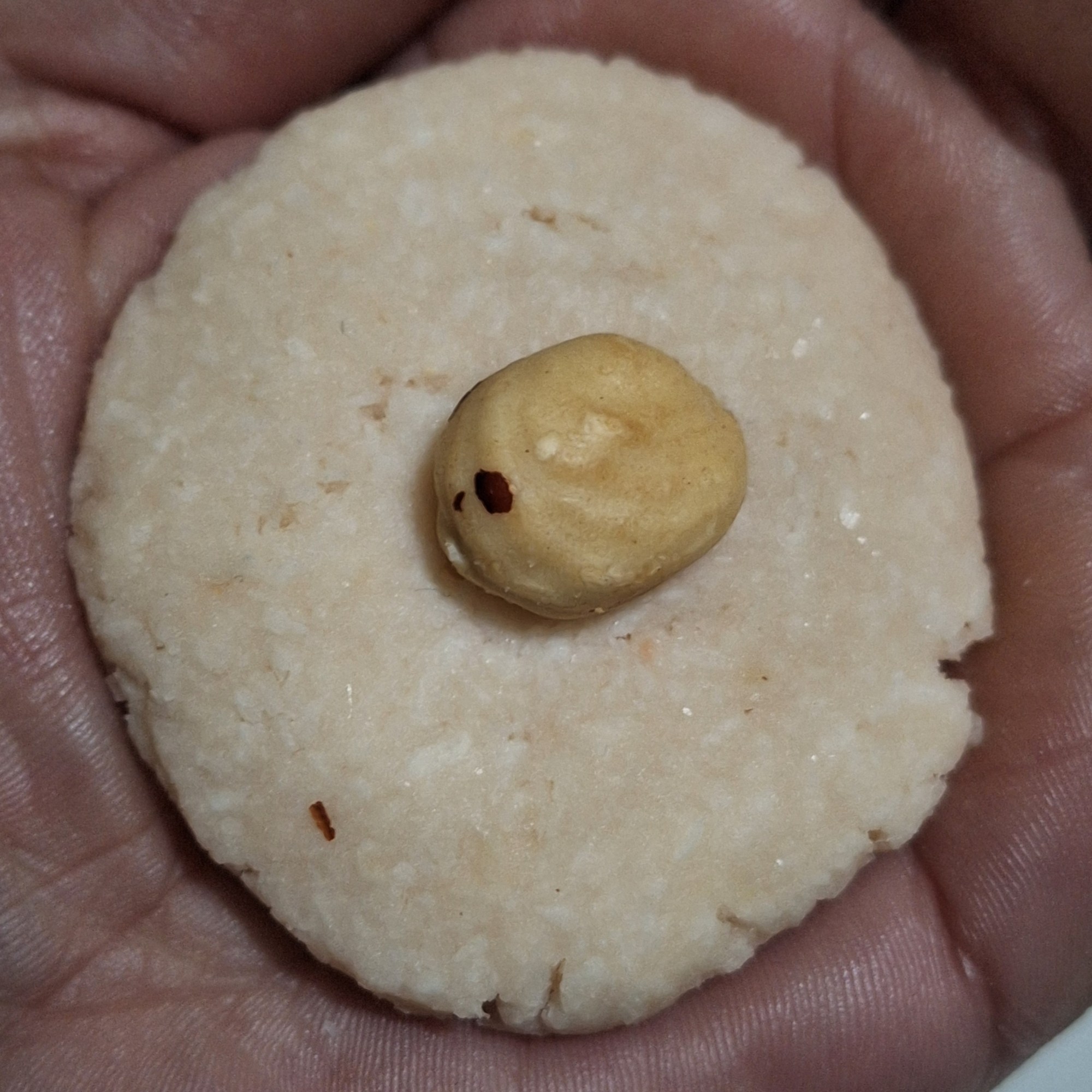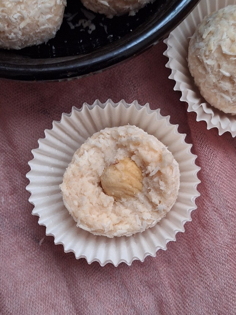 Haz bolitas tamaño bombón Raffaello, aplasta y coloca una avellana en el centro. Cierra dando forma y reboza en coco rallado. Guarda en el frigo, al menos una hora, para que adquieran consistencia.