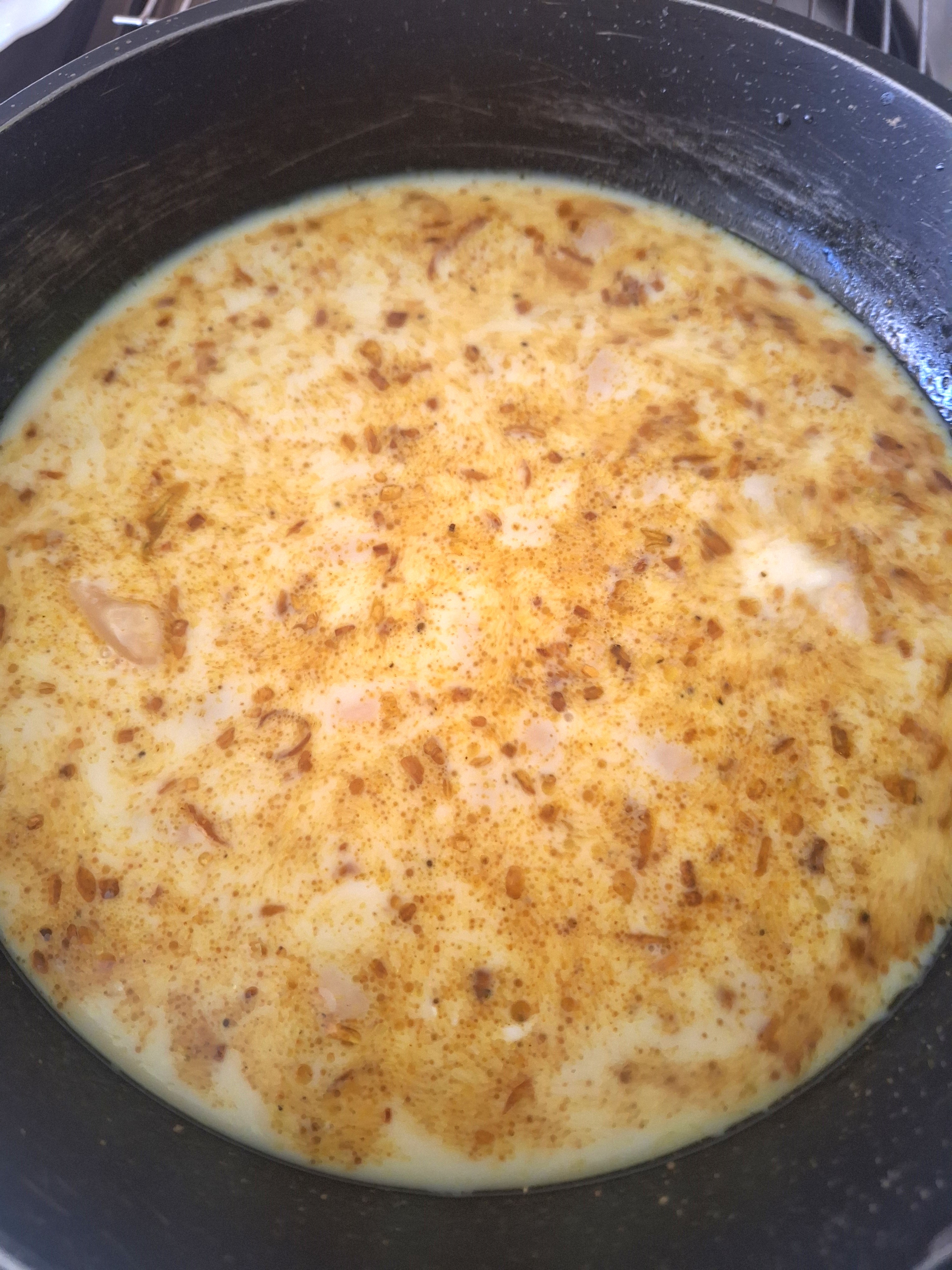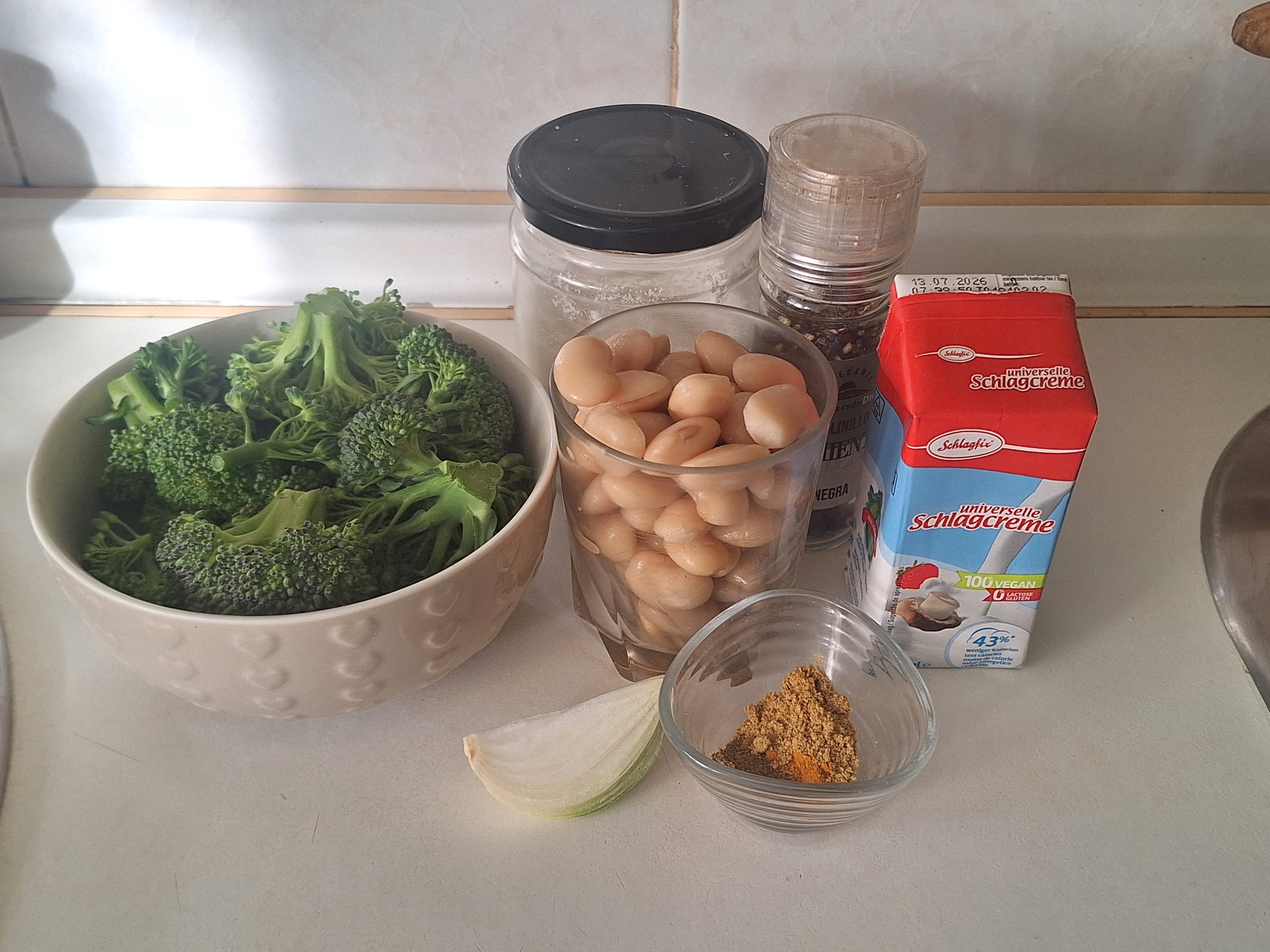 Corta la cebolla en brunoise y pocha en un poquito de aceite. Cuando transparente añade las especias, mezcla y cocina un minuto. Agrega la nata vegetal y las alubias y cocina 5 minutos más. Si quieres más salsa añade bebida vegetal al gusto.