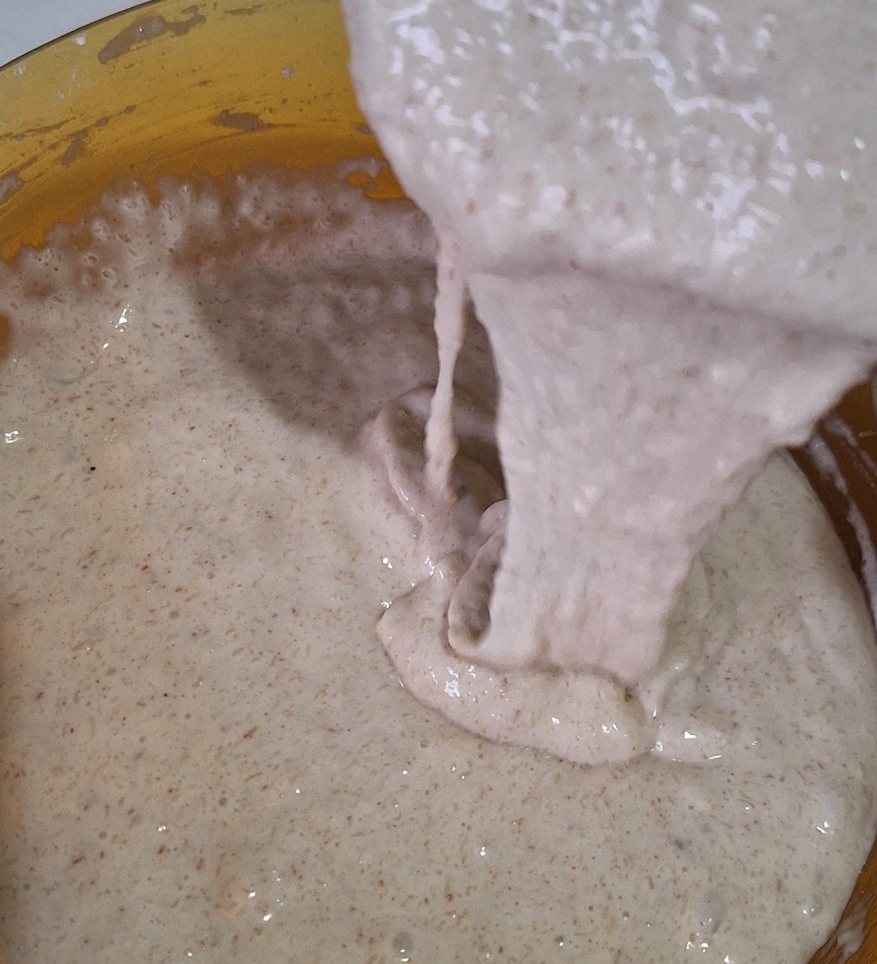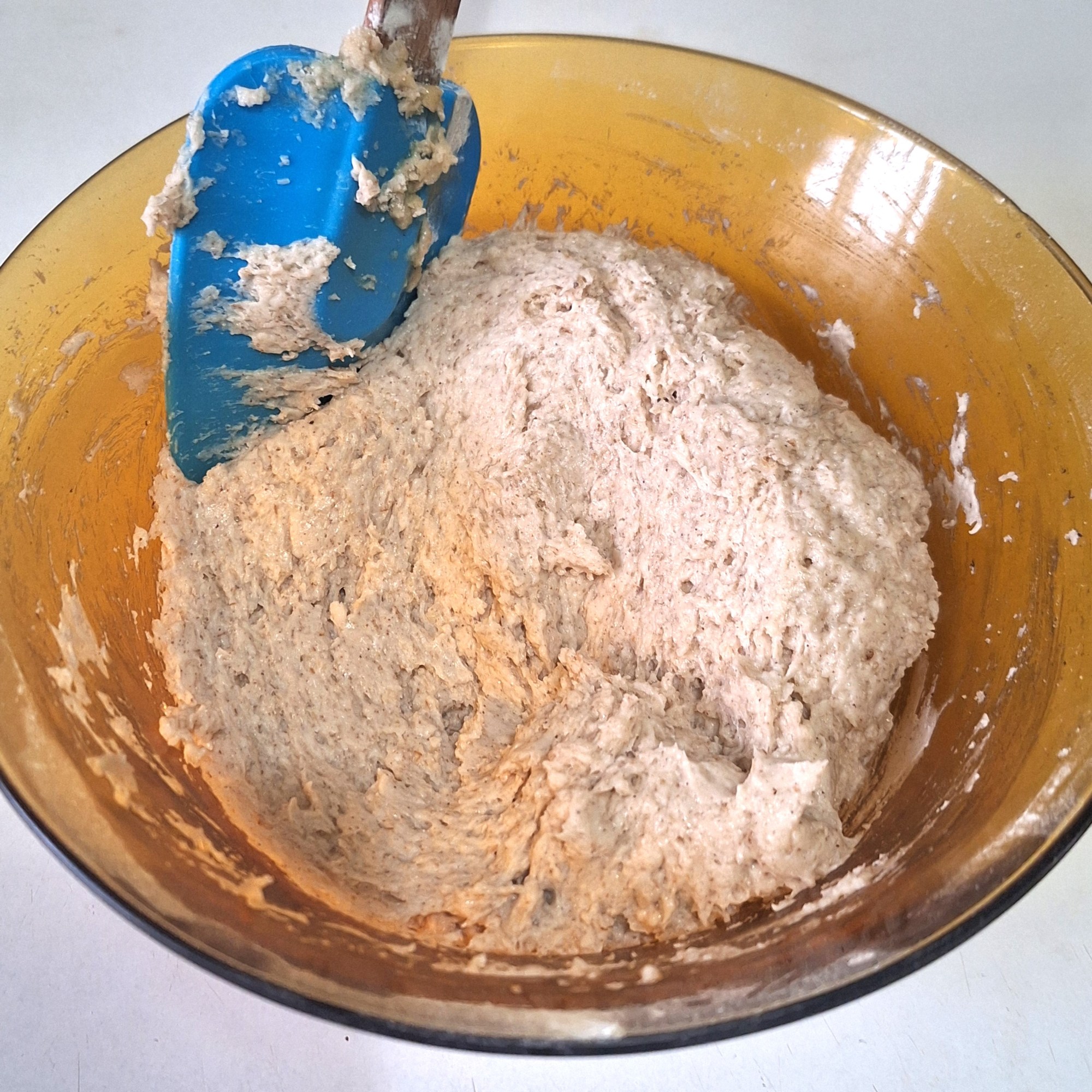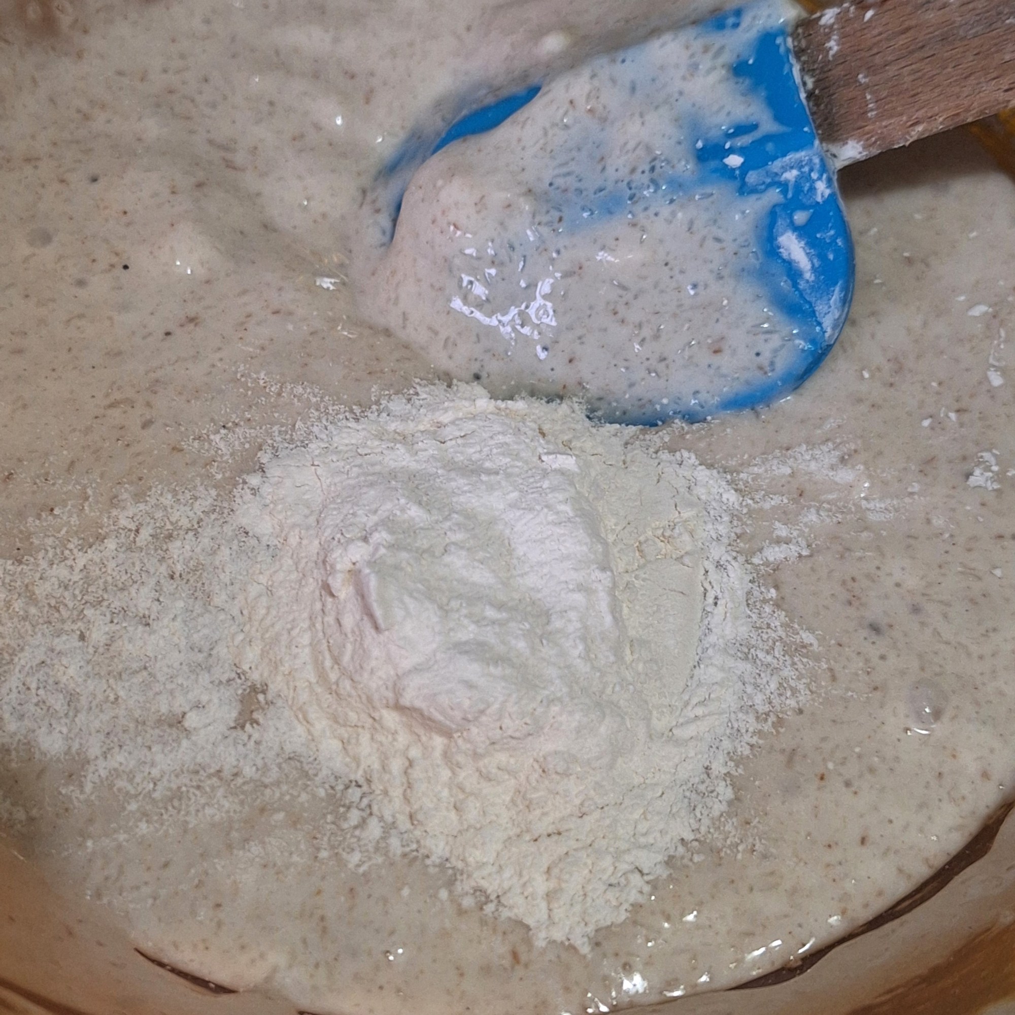 Tamiza los secos salvo la xantana y mezcla bien. Haz un hueco en el centro y añade el prefermento y el gel de psyllium. Integra los ingredientes para que no queden partes secas.
