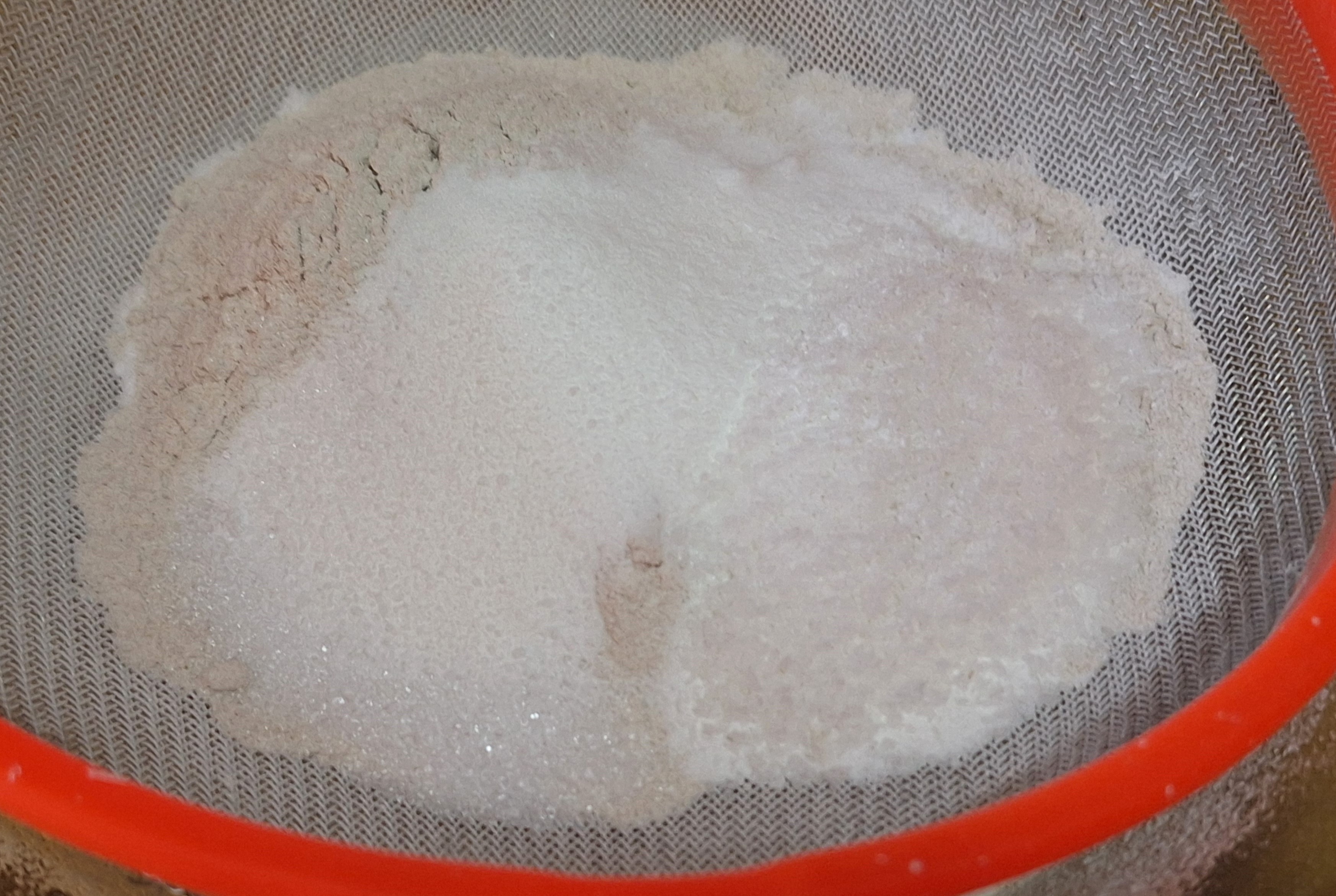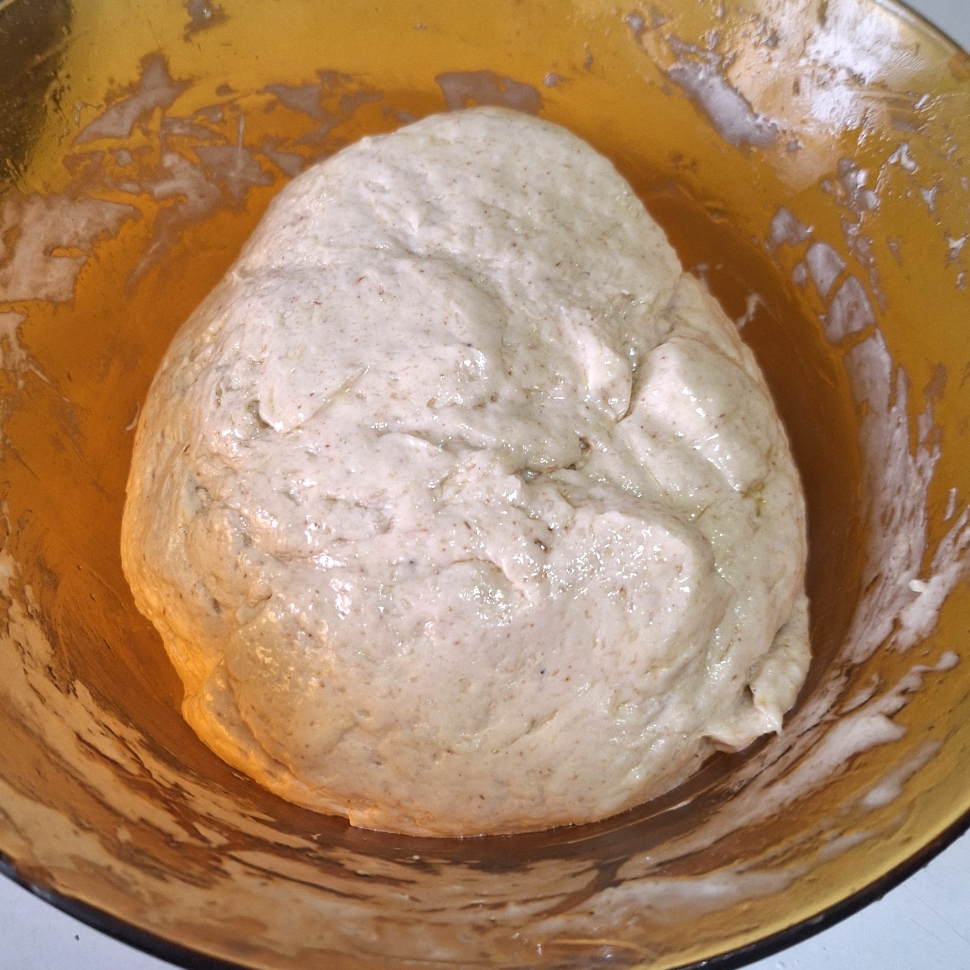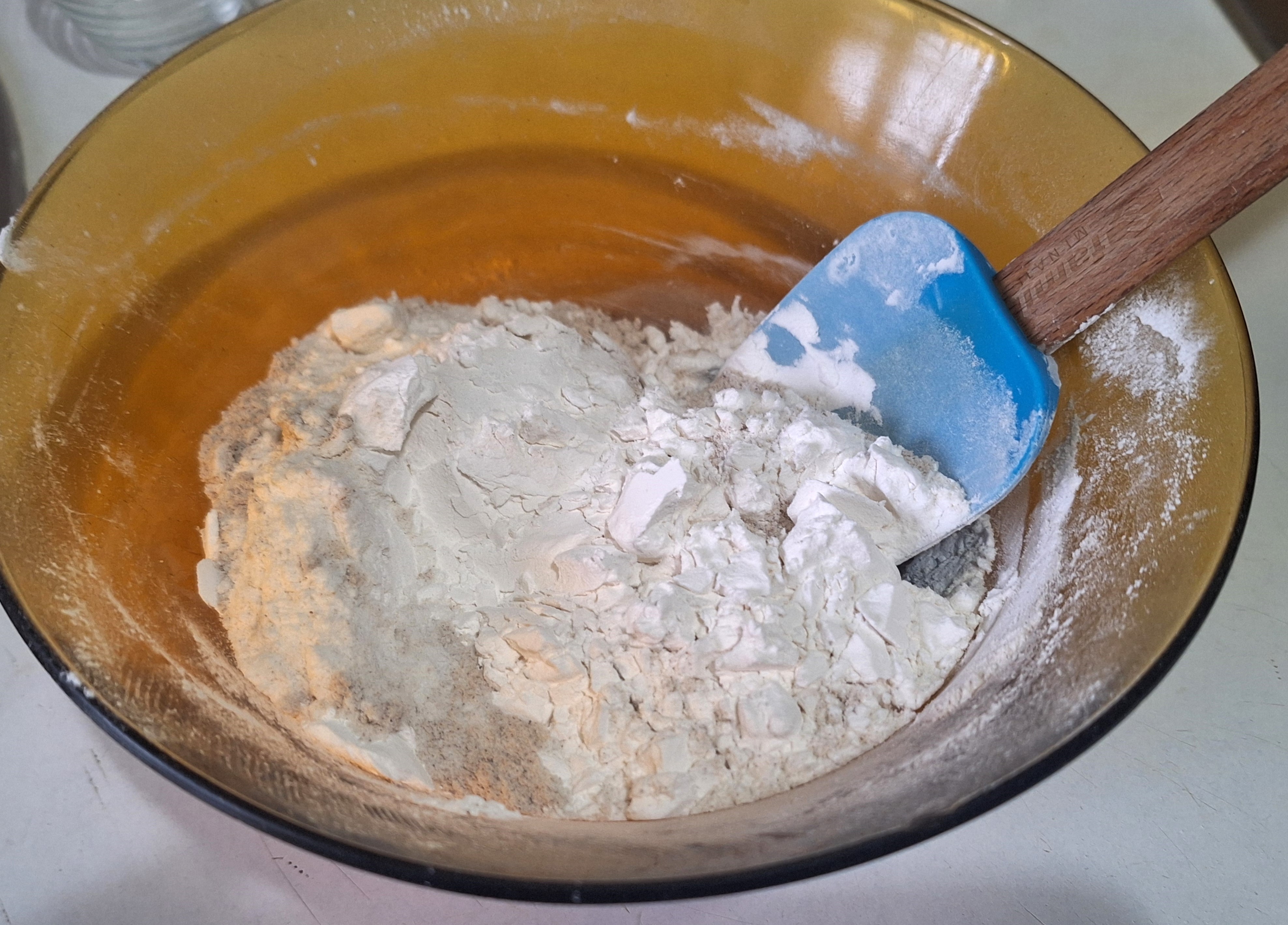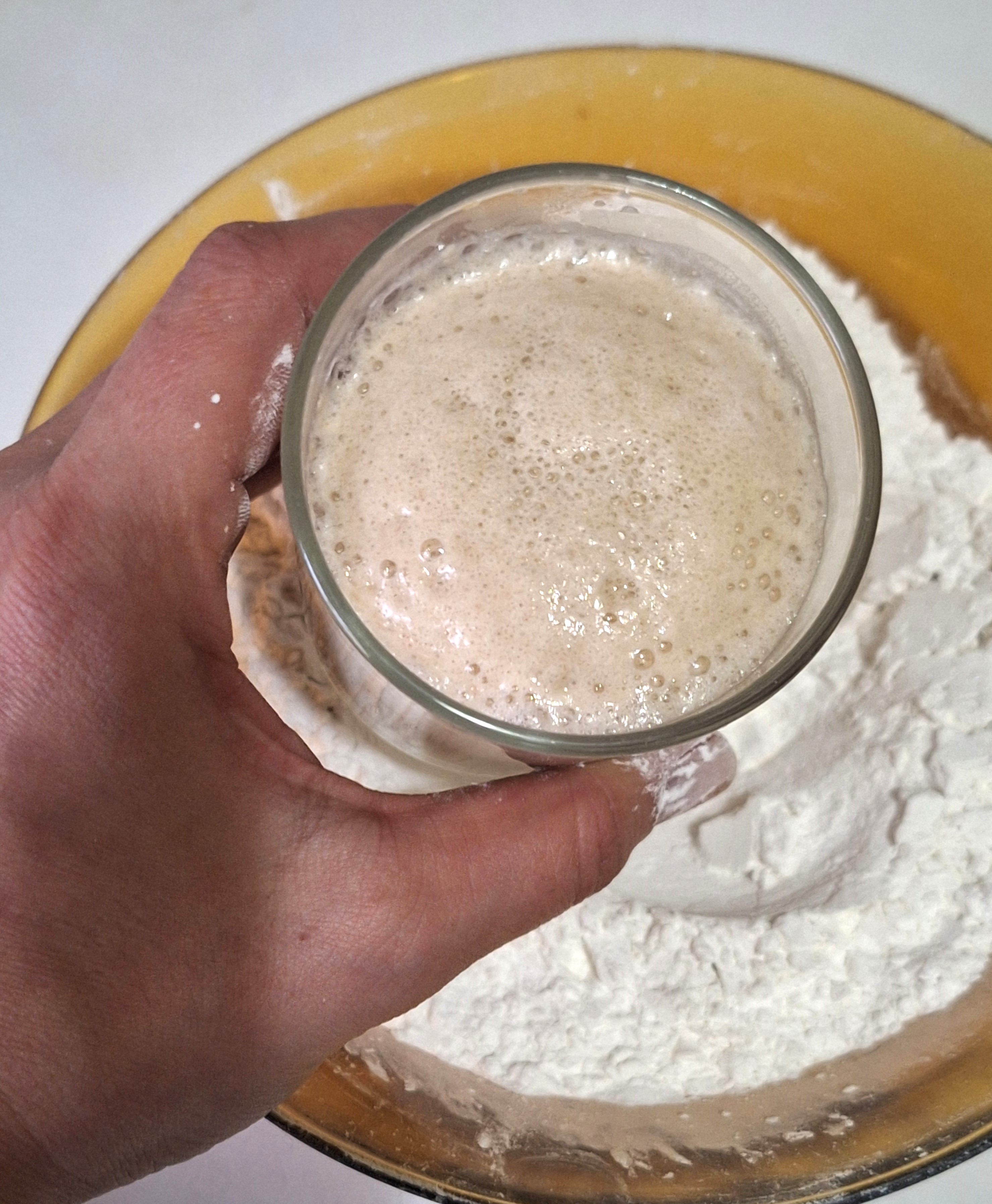 Tamiza los secos salvo la xantana y mezcla bien. Haz un hueco en el centro y añade el prefermento y el gel de psyllium. Integra los ingredientes para que no queden partes secas.
