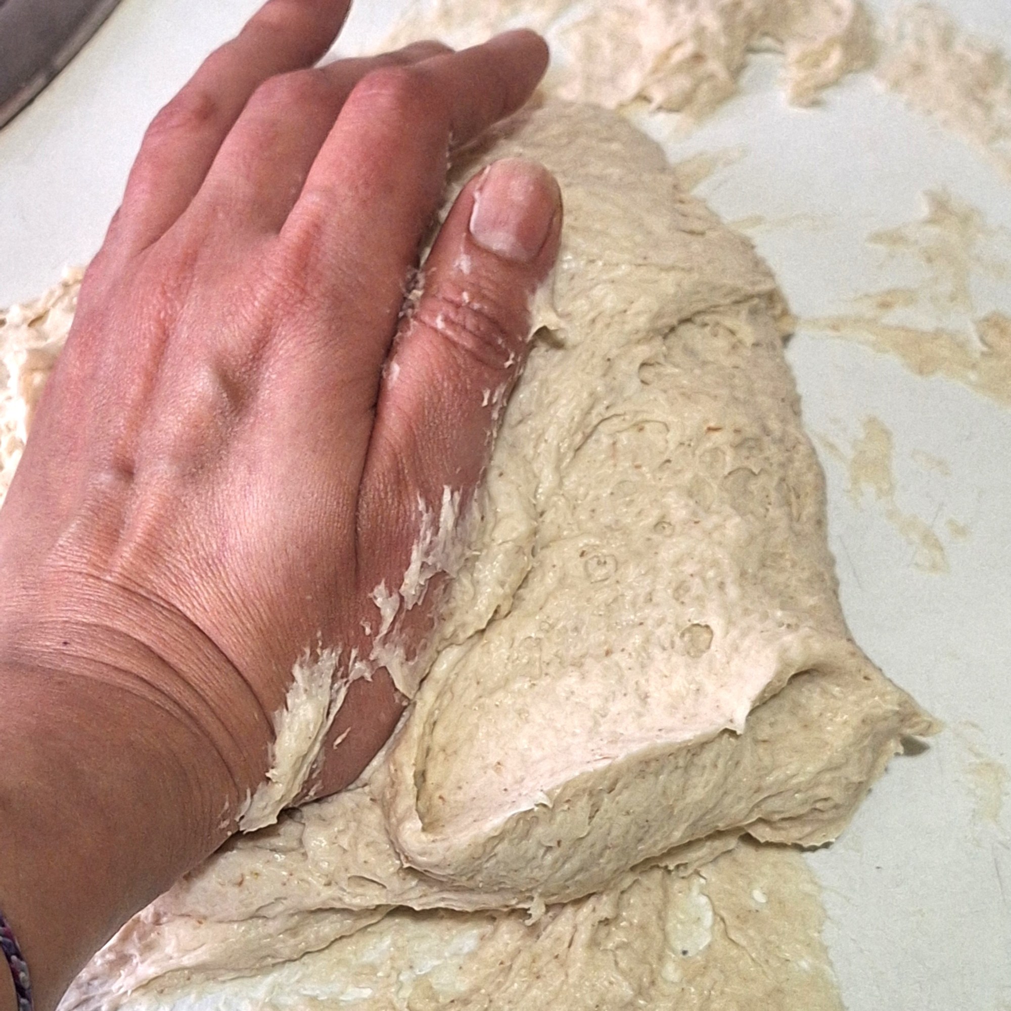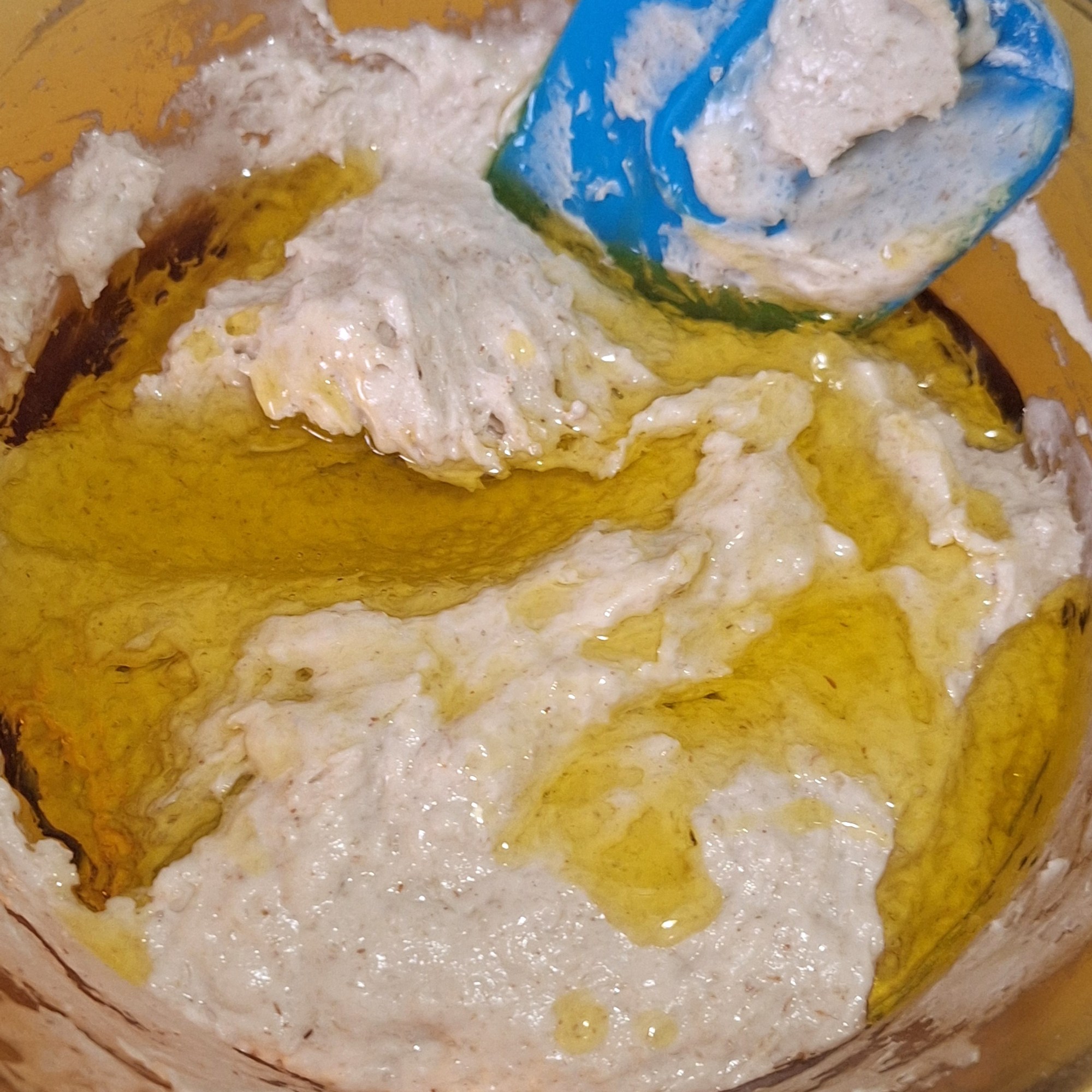Añade la xantana y mezcla con cuidado para que no se evapore. Finalmente agrega el aceite y mezcla muy bien, con las manos (es una masa muy pegajosa).