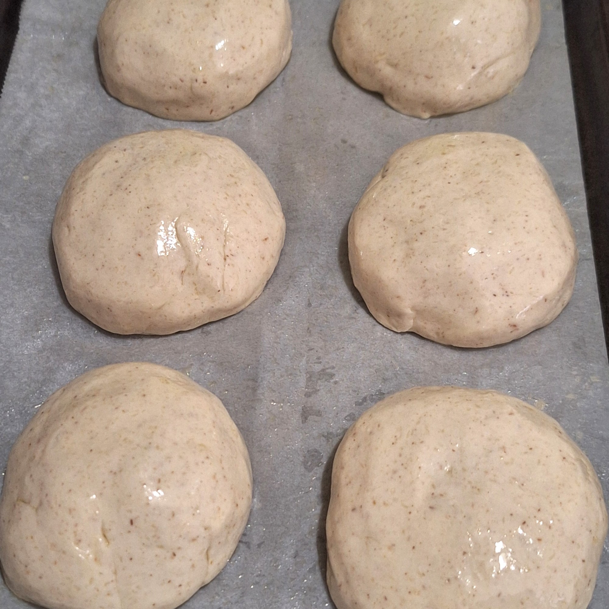 Vuelca sobre la superficie de trabajo y amasa unos 15 minutos. Engrasa tus manos con aceite y bolea. Divide en porciones de 114 gr, bolea y deja reposar sobre una bandeja cubierta con papel vegetal. Cubre con film aceitado y reposa en lugar cálido 1 h o 1:30h, hasta que duplique volumen.