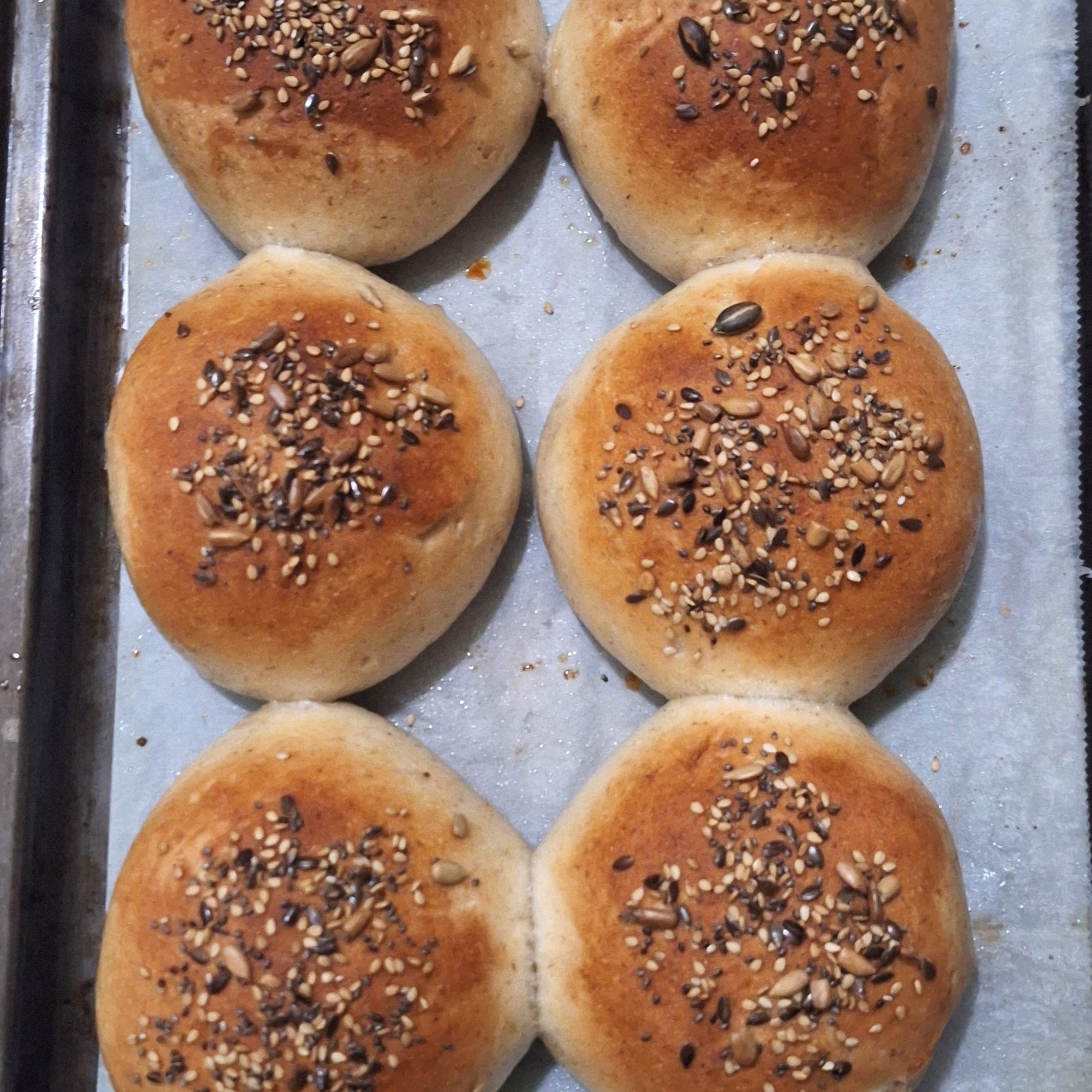 Pincela el pan con el barniz y espolvorea semillas variadas.