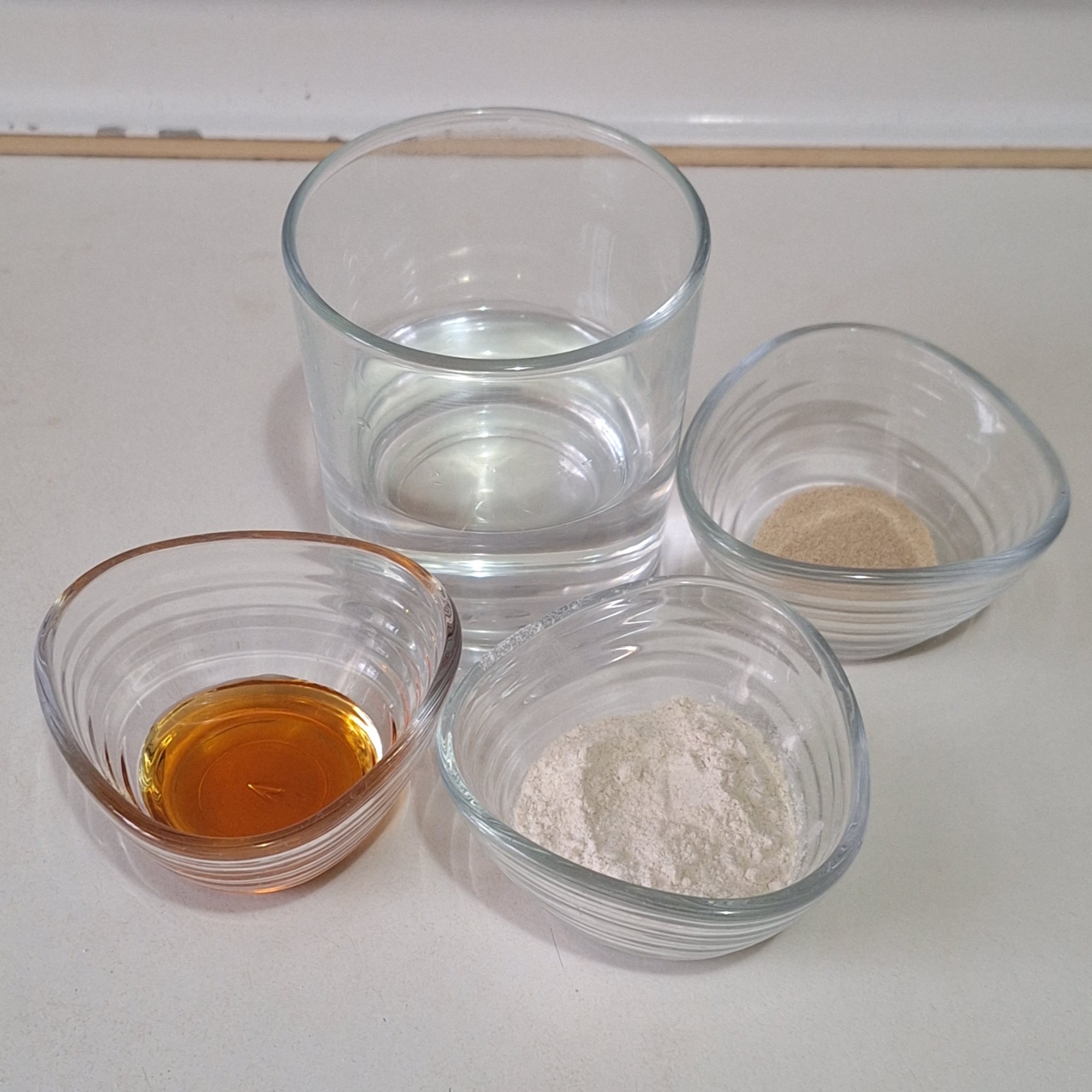 Prepara el prefermento mezclando los ingredientes con agua tibia. Cubre y deja fermentar hasta duplicar volumen. Mezcla el psyllium con el resto del agua templada y deja reposar hasta crear un gel.