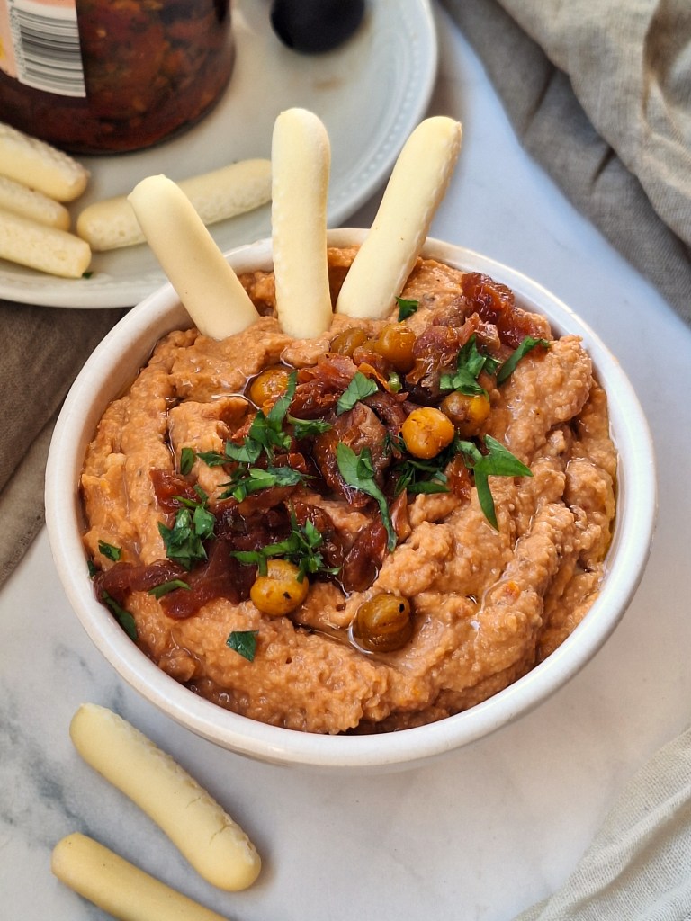 !Buenas noches corazones! Otro domingo de reto de legumbres, así que ya sabéis lo que nos toca. La capitana legumbrita de la semana nos pedía hummus con vegetales y mucho color, así que no se me ocurrió mejor idea que un hummus con crudités. En un principio mi idea era hacer una tabla con diferentes tipos de hummus, pero no he tenido mucho tiempo, así que decidí hacer un hummus de tomate seco, que era una versión que aún no había probado y que me ha encantado.