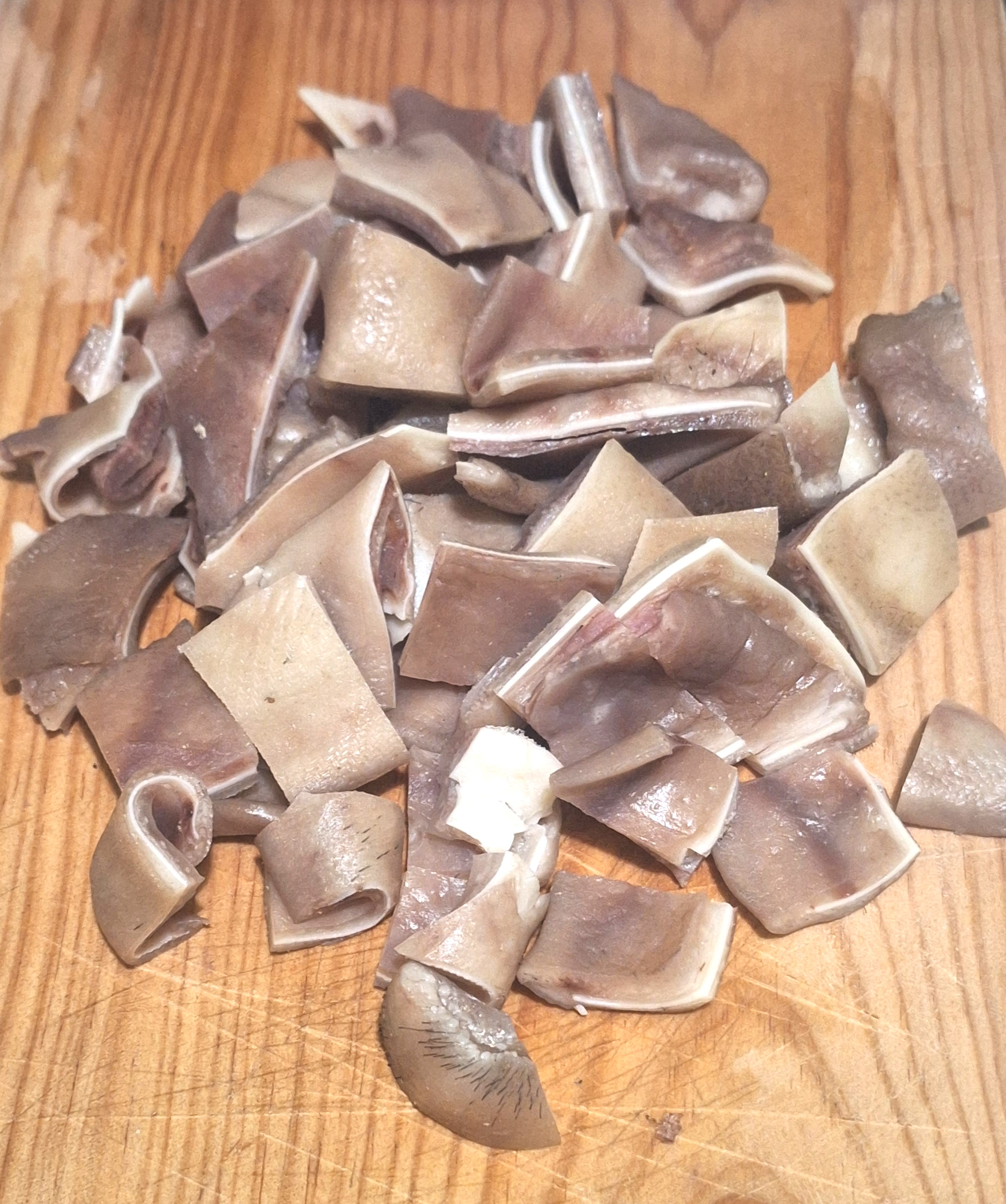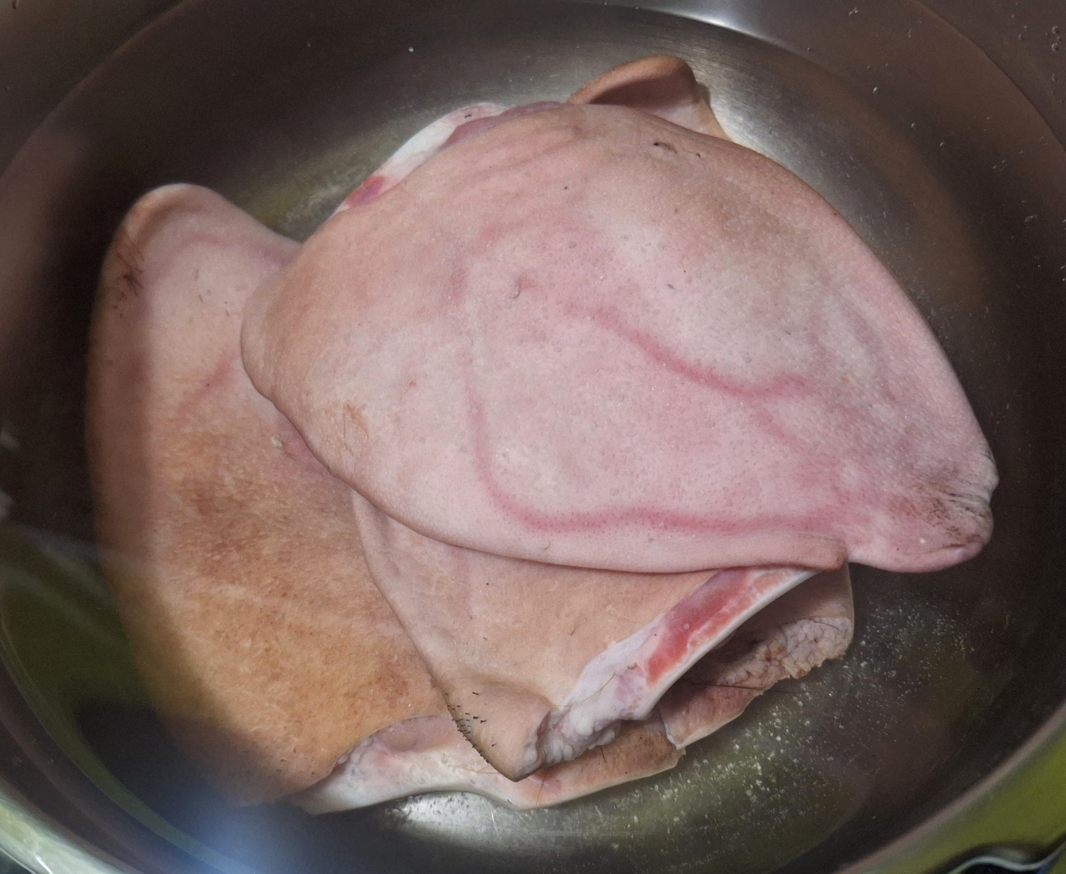 Limpia las orejas (en caso de que no lo estén) y cuece en una olla a presión con abundante agua y sal hasta que estén tiernas. Deja atemperar y corta en trozos tamaño bocado.