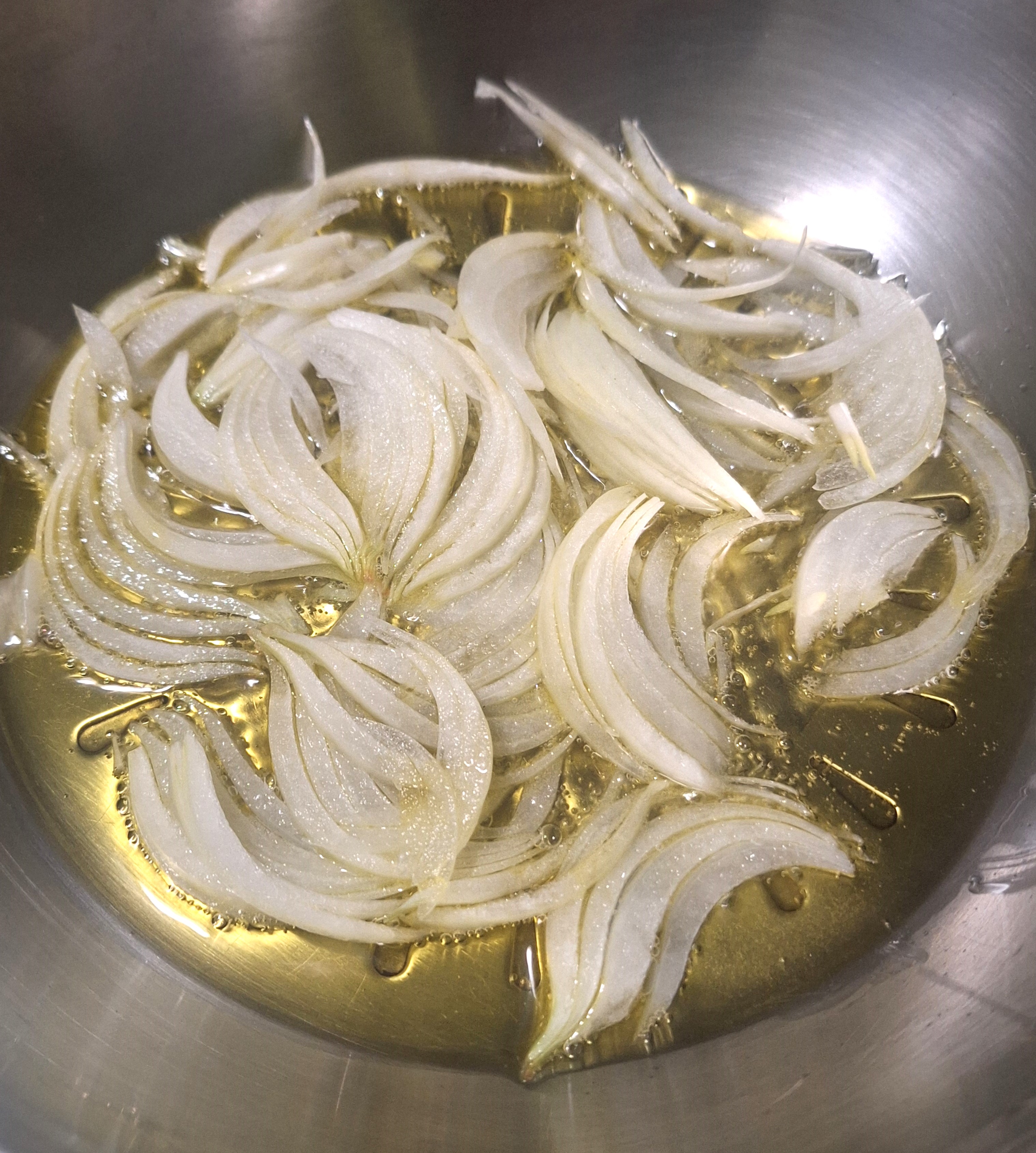 Corta la cebolla en juliana fina y pocha en un poco de aceite. Cuando esté transparente añade el ajo (si lo incluyes) y cocina sin dejar que se dore demasiado.