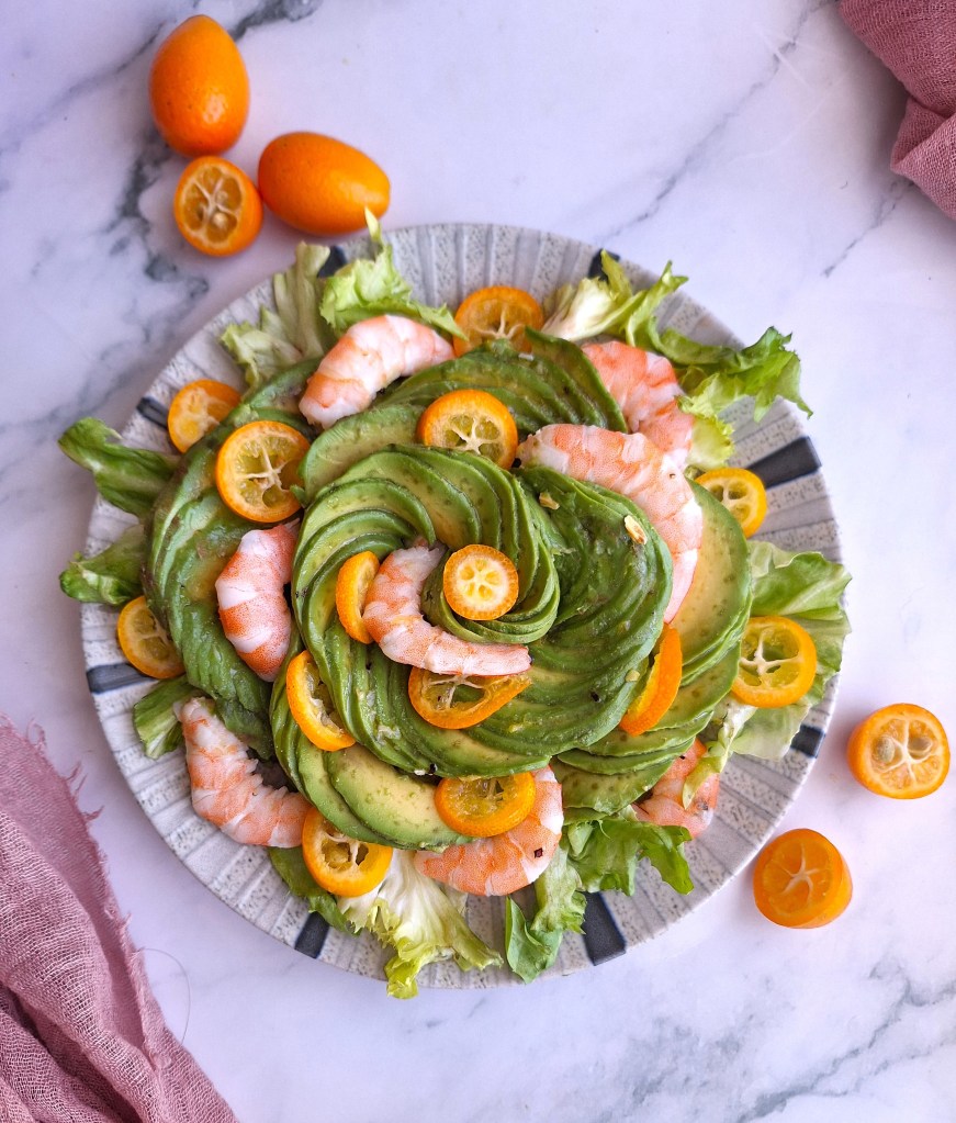 La idea de esta ensalada surgió hace tiempo, allá por las Navidades, pero como la presentación no me quedó como yo esperaba (soy perfeccionista y maniática hasta decir basta), se quedó guardadita en el baúl de los «paluegos». Y el otro día, cuando compré unos aguacates estupendos en el mercado, decidí recuperar la receta y hacer algunas variaciones. Por eso añadí el kumquat, que aporta mucha personalidad al plato, tanto por su peculiar sabor como por el efecto visual que crea. Sencillamente, me encantan.