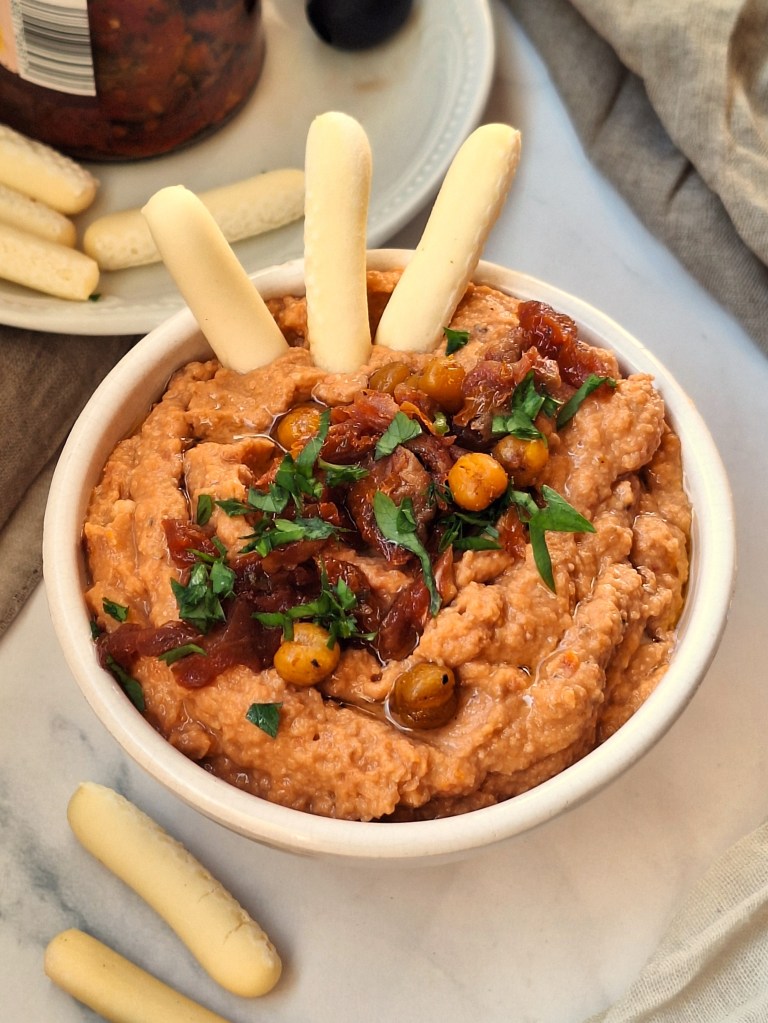 La receta original está riquísima, pero podéis jugar con los sabores y añadir diferentes ingredientes de temporada para disfrutar al máximo y enriquecerlo aún más. Esta variante con tomate seco se ha convertido en una de mis favoritas, junto con el de pimiento asado y el de mango. Tiene un sabor intenso y es perfecto para tomar en tostadas, acompañado de anchoas y aceitunas negras o con aguacate.