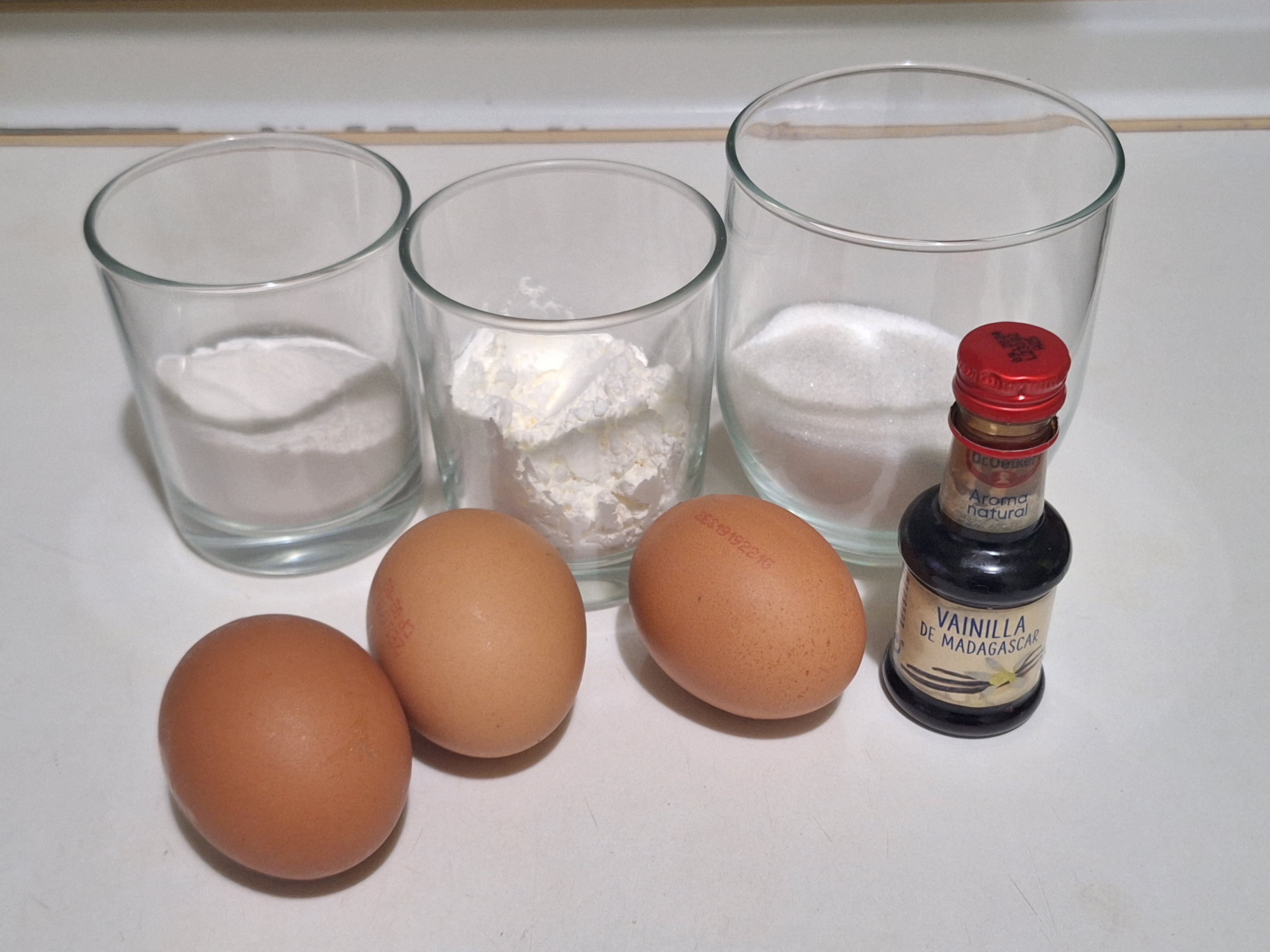Prepara el bizcocho: separa las yemas de las claras. Vierte las claras en un recipiente amplio y bate con varillas eléctricas. Cuando empiece a espumar añade azúcar (vamos a utilizar la mitad del total y añadirlo en 3 tandas). Sigue batiendo e incorporando el azúcar hasta obtener picos firmes y reserva.