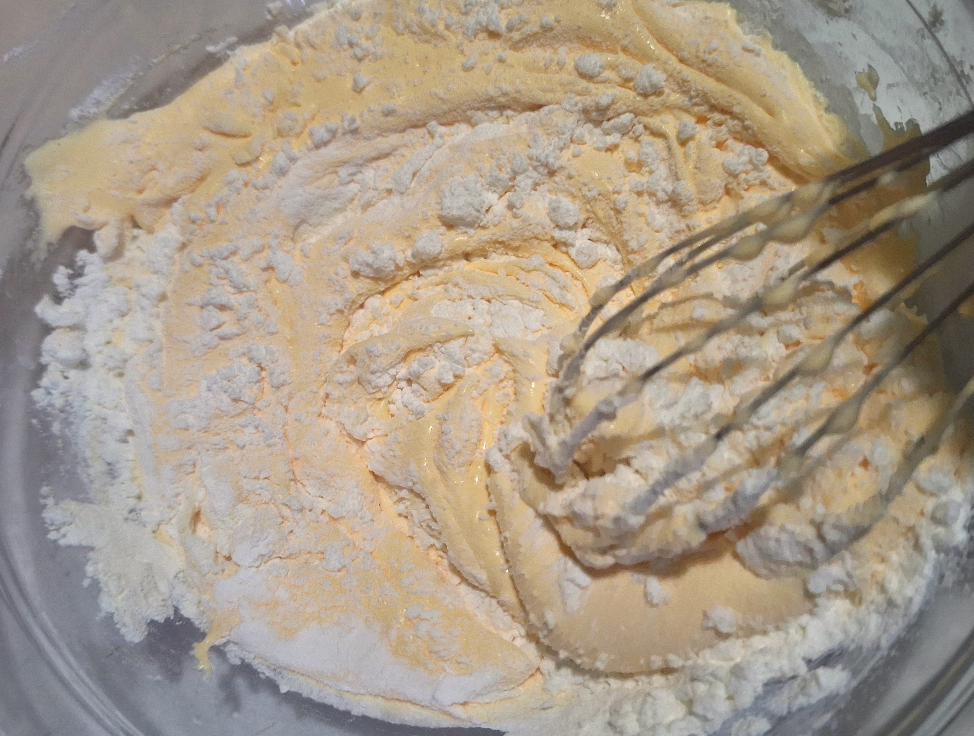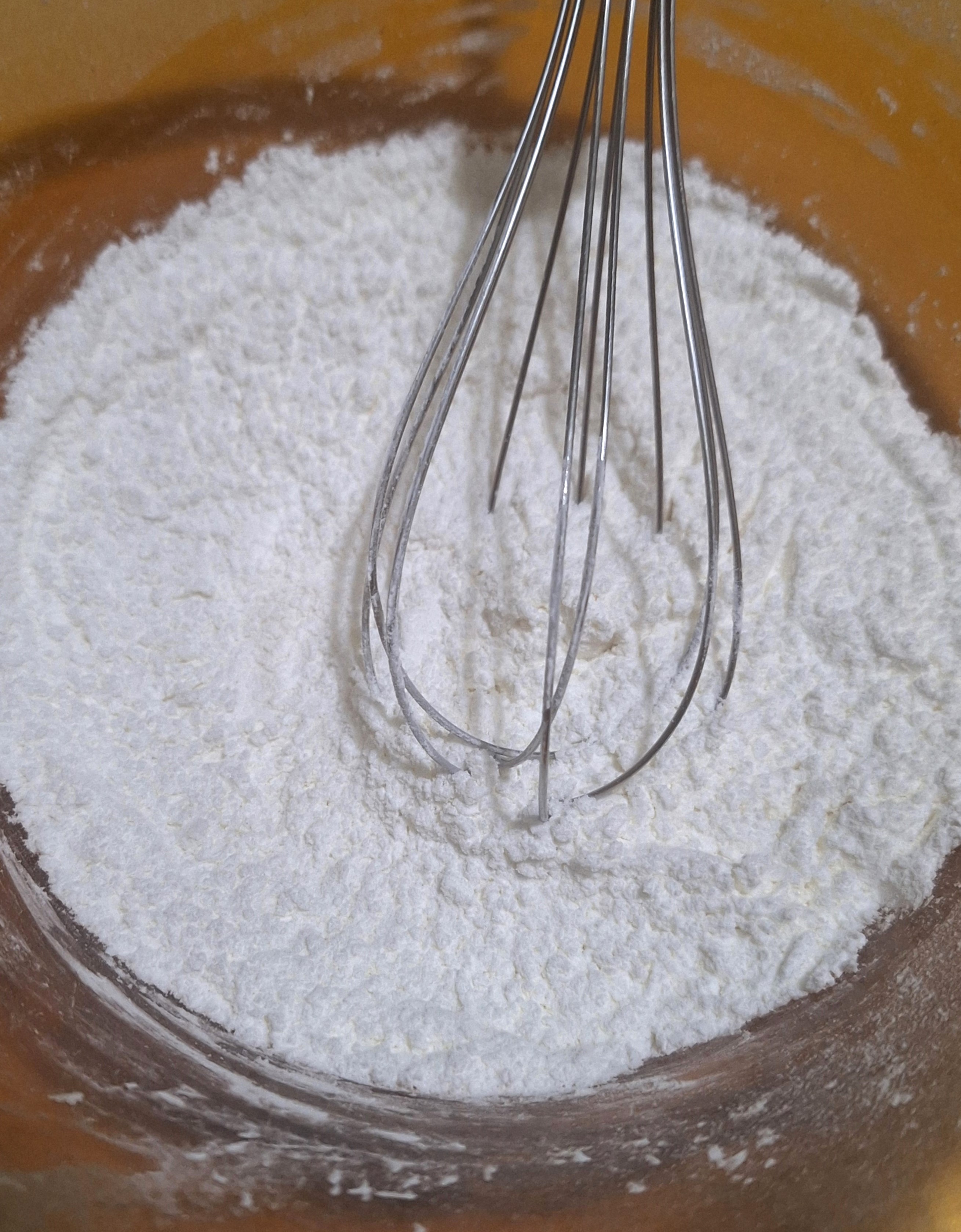 Tamiza los secos (harina y almidón) y mezcla bien. Añade a las yemas poco a poco, mezclando con varillas (es más fácil para disolver los grumos).