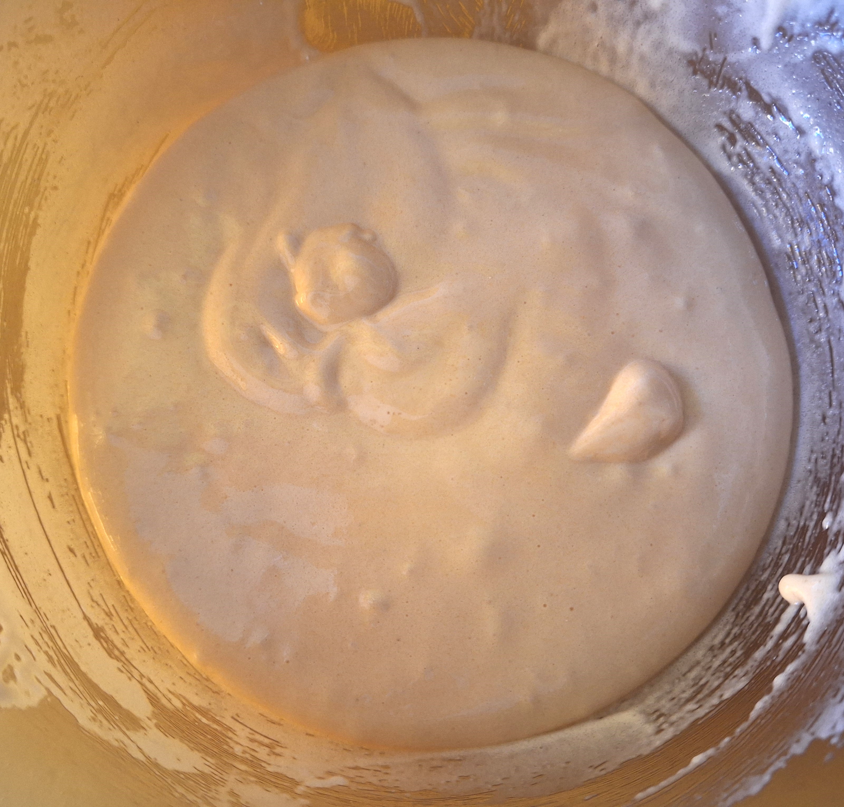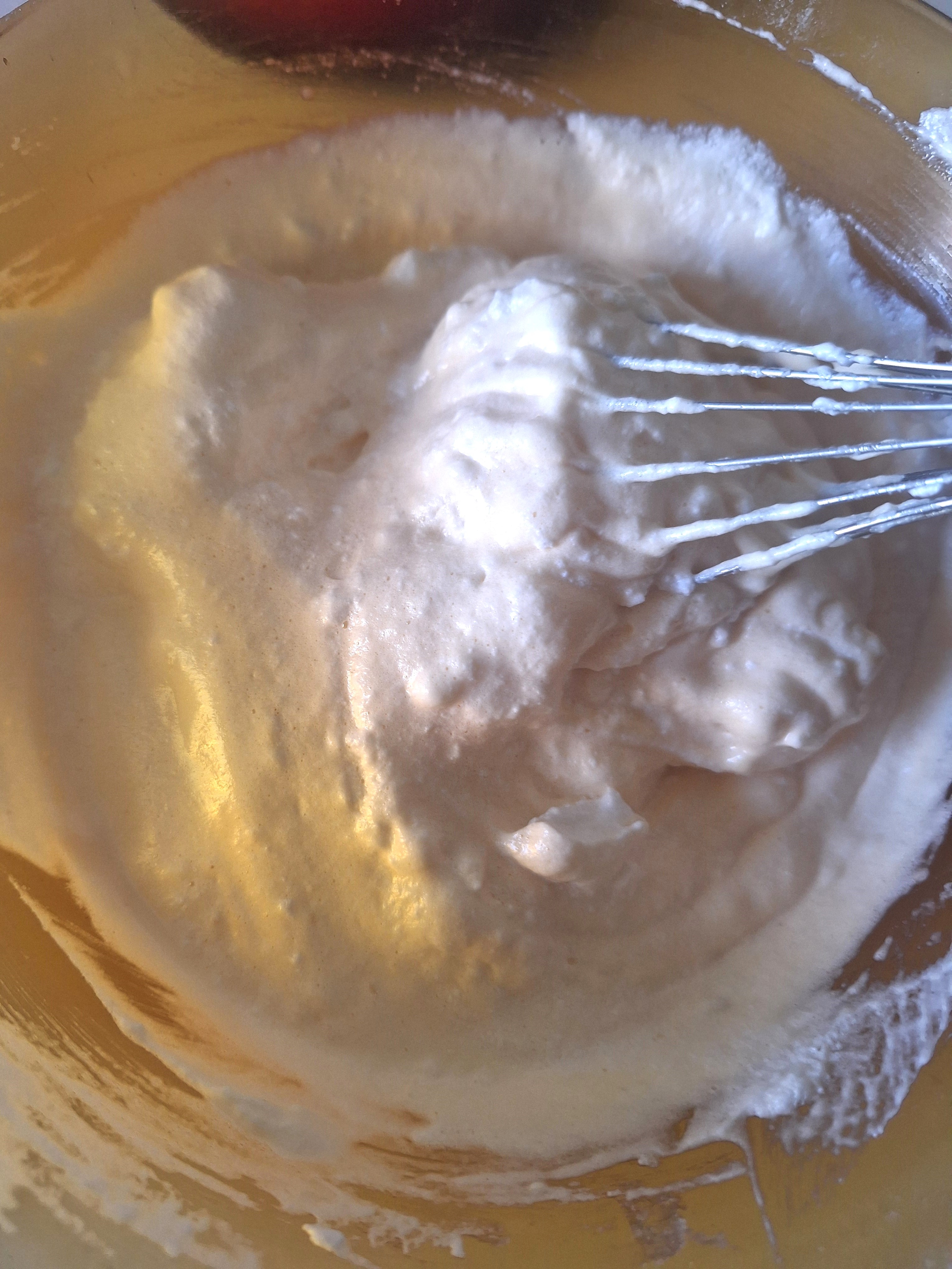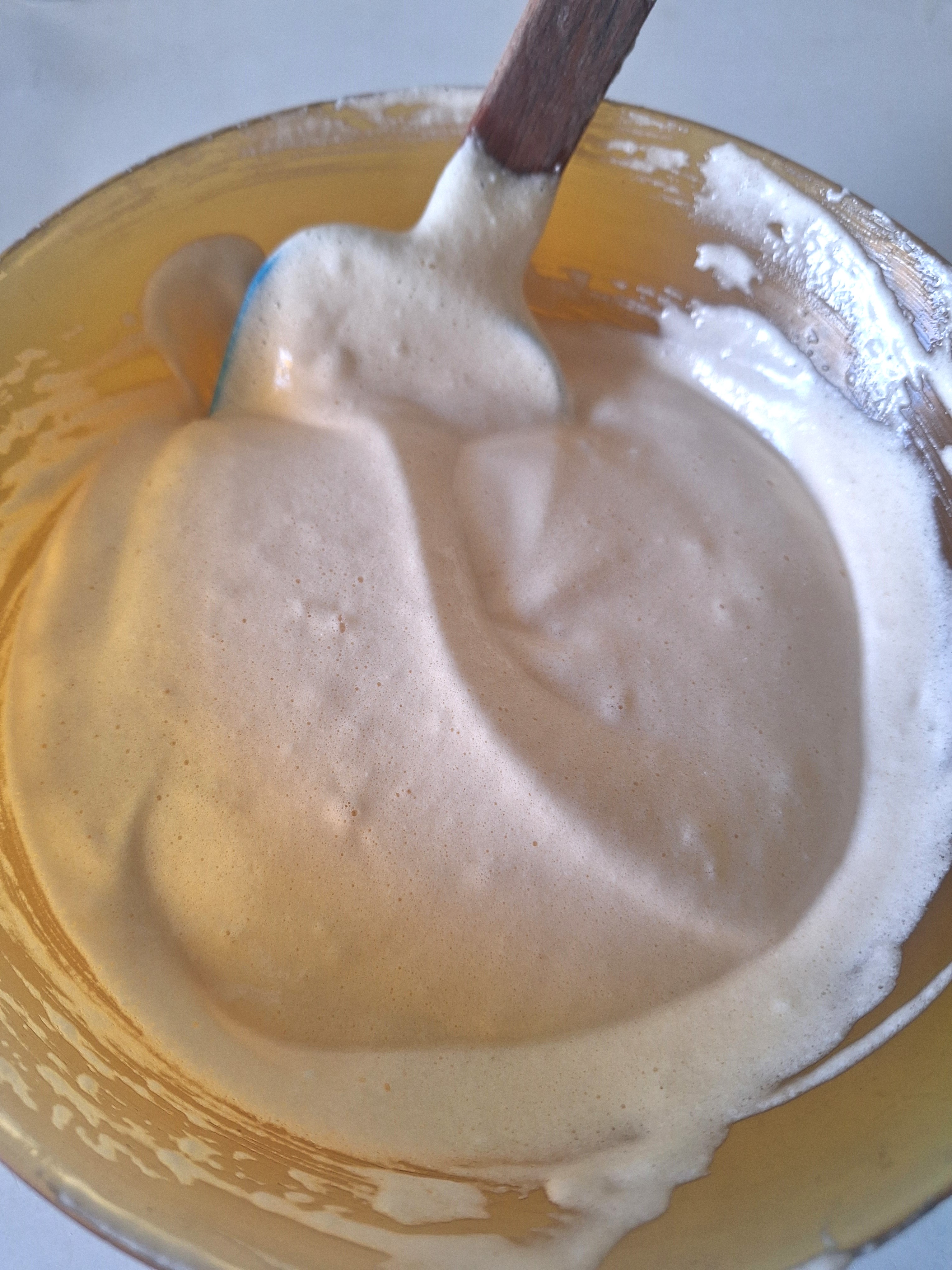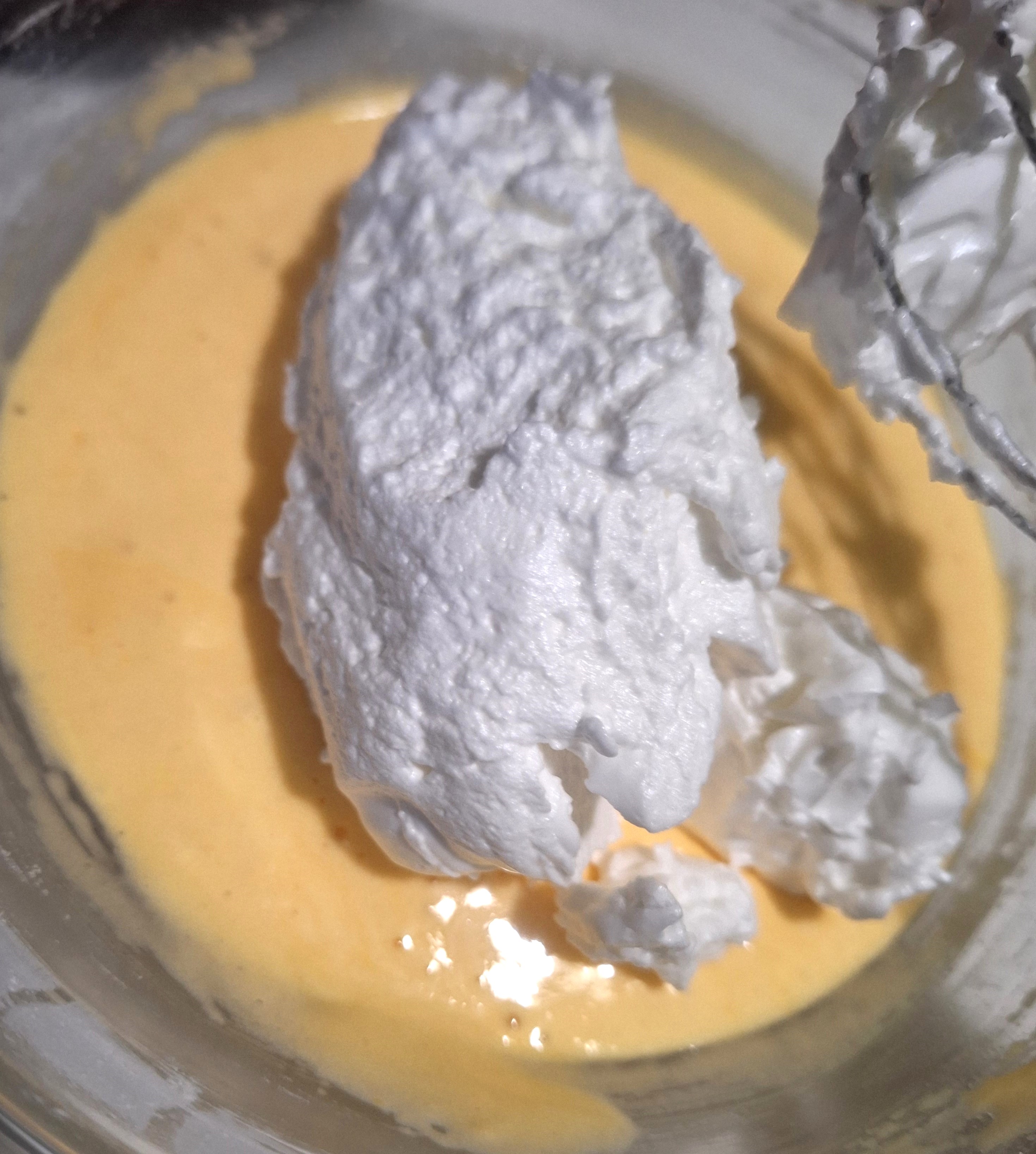 Cuando esté todo integrado añade una buena cucharada de claras y envuelve con varillas. Aunque es un poco densa se hará más fluida. Incorpora el resto de las claras y no sobre batas la mezcla para que no se baje.