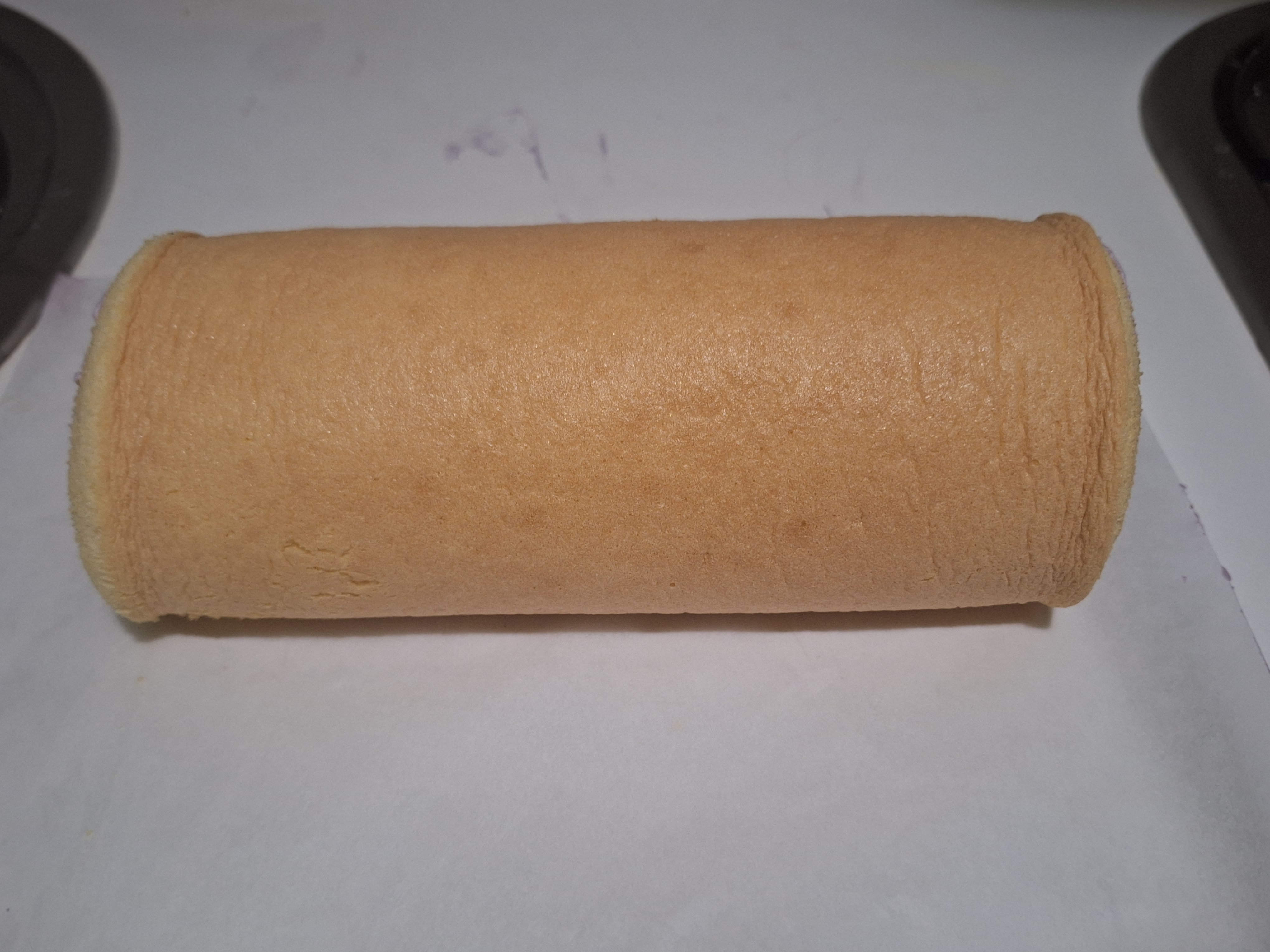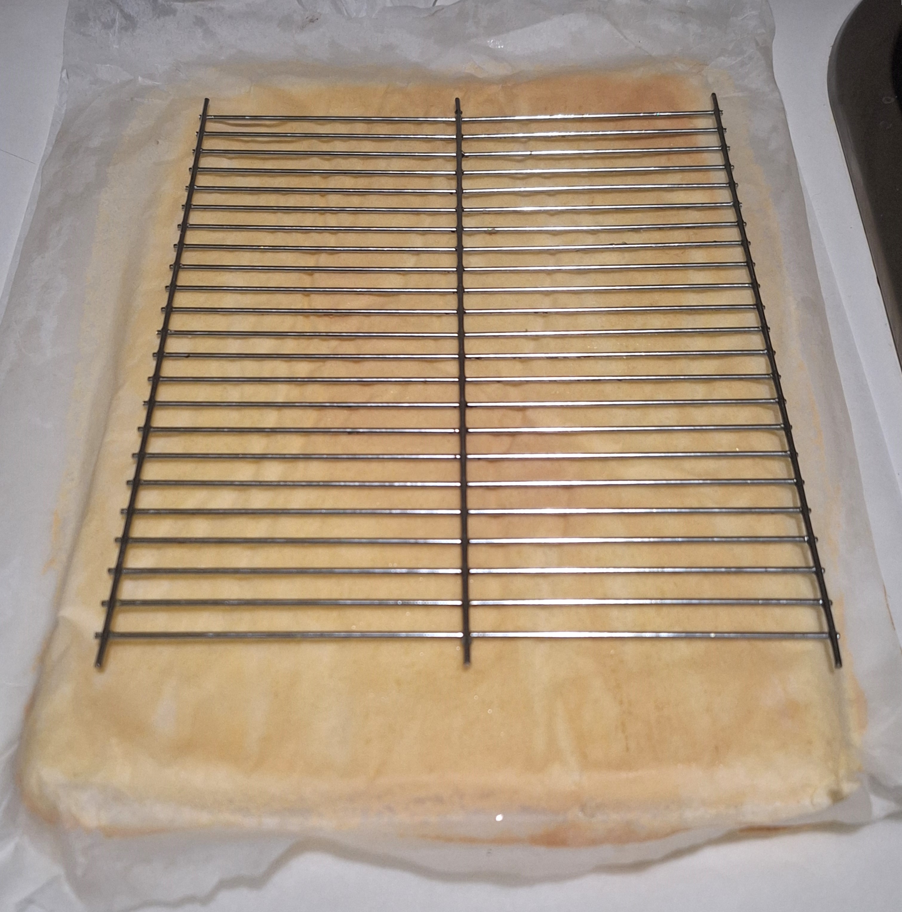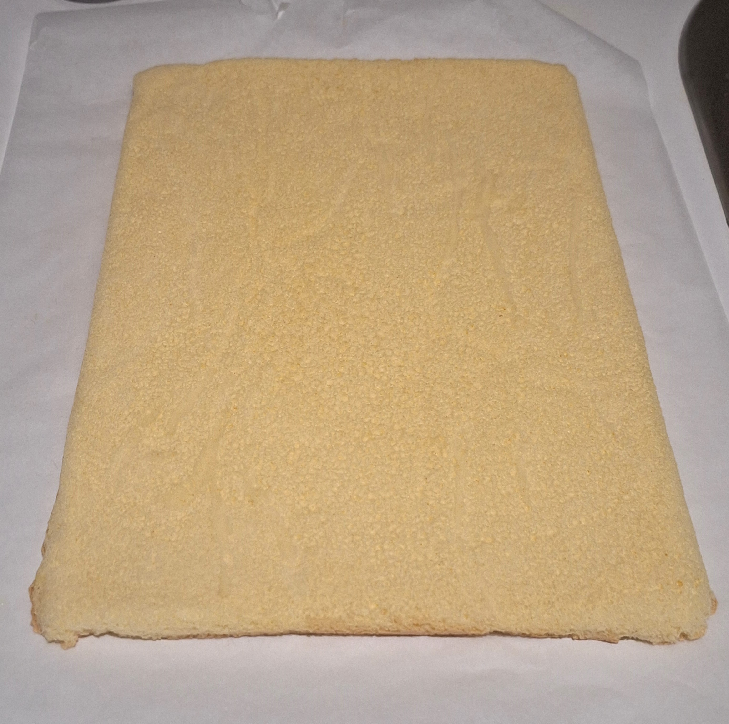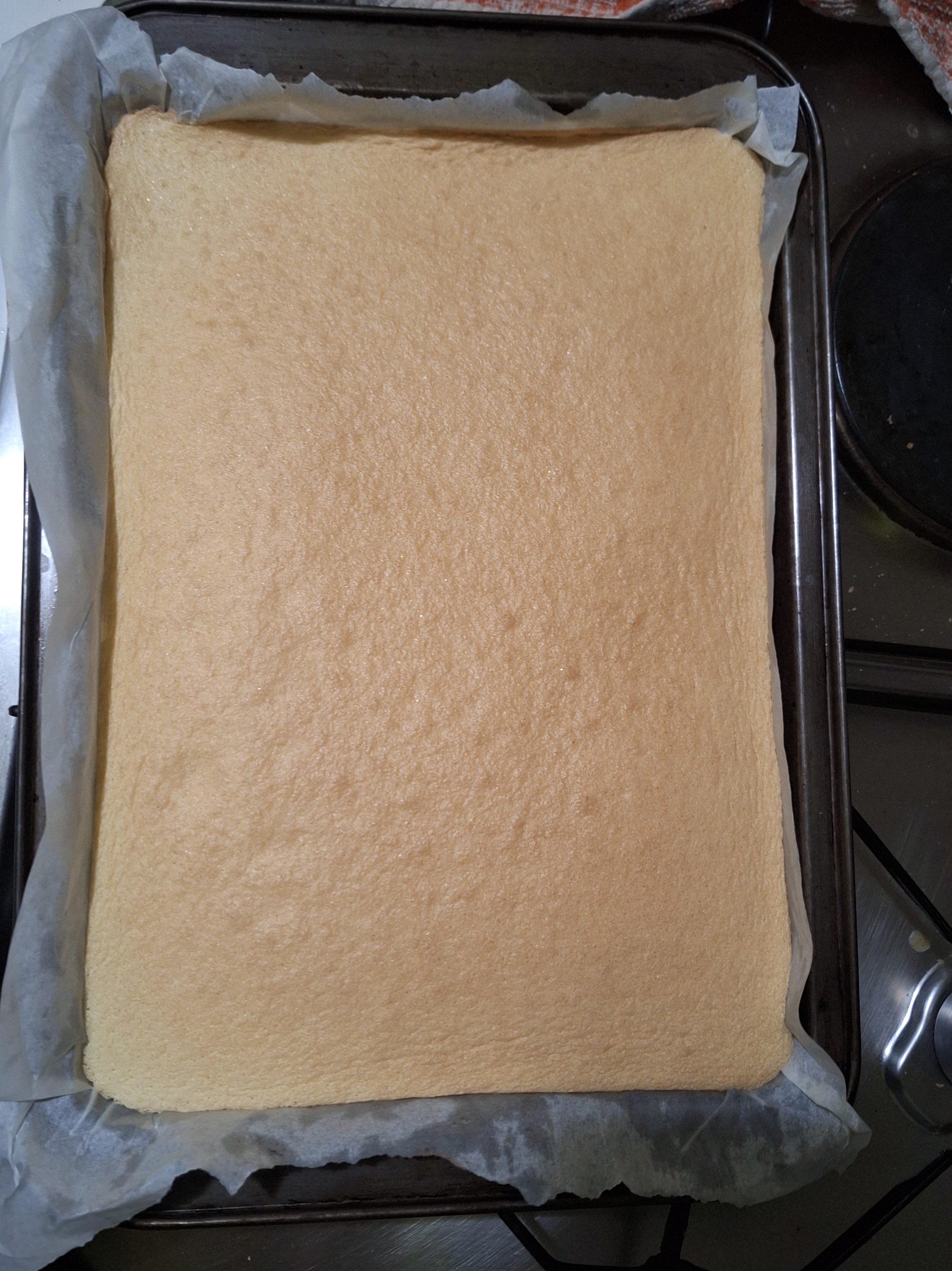 Precalienta el horno a 175ºC. Forra una bandeja con papel de horno y engrasa bien. Extiende la masa con ayuda de una espátula intentando que mantenga un grosor uniforme. Hornea hasta que adquiera un ligero color dorado (no te pases o se te romperá al enrollarlo). En mi horno ha estado durante 8 minutos.