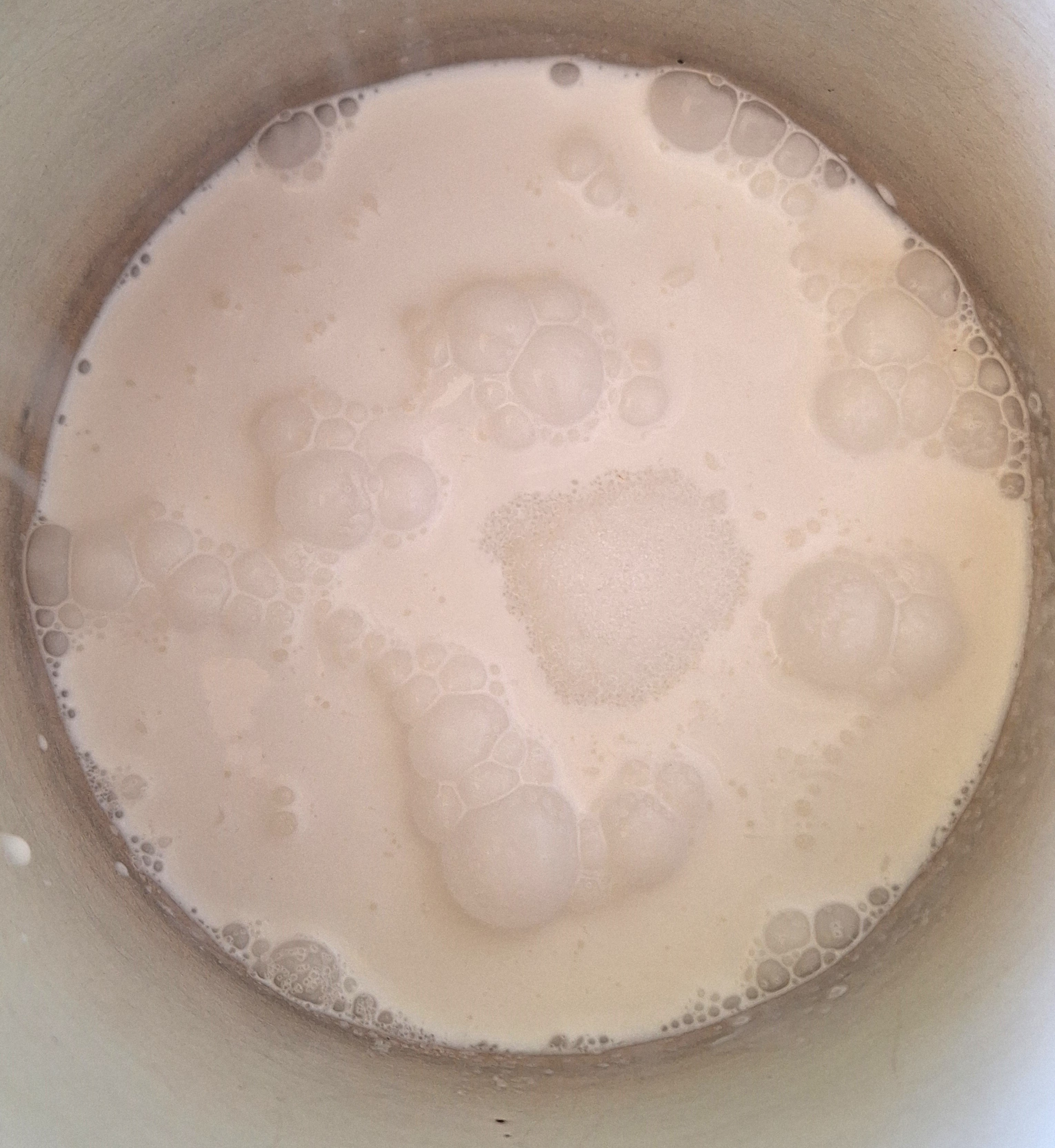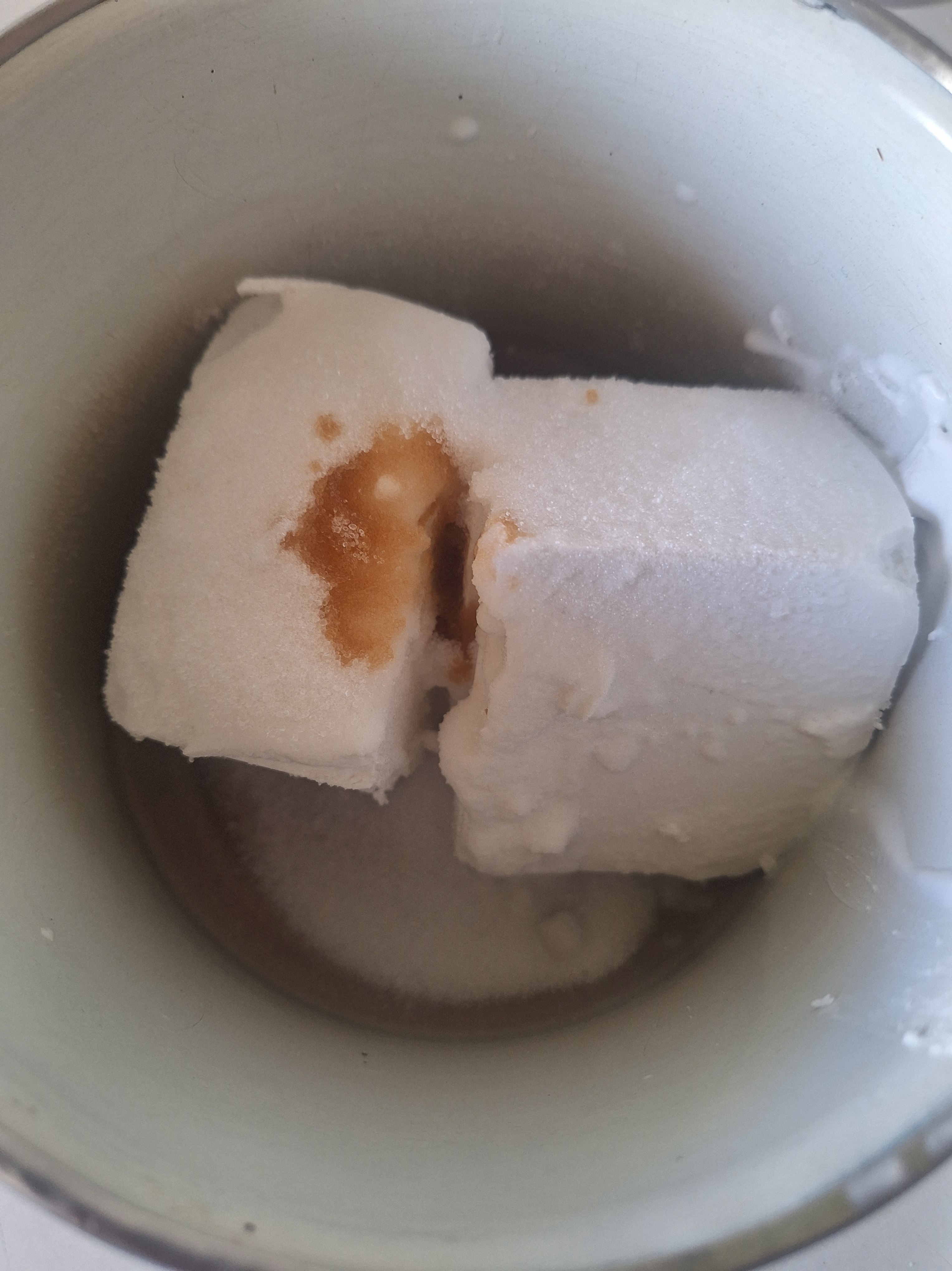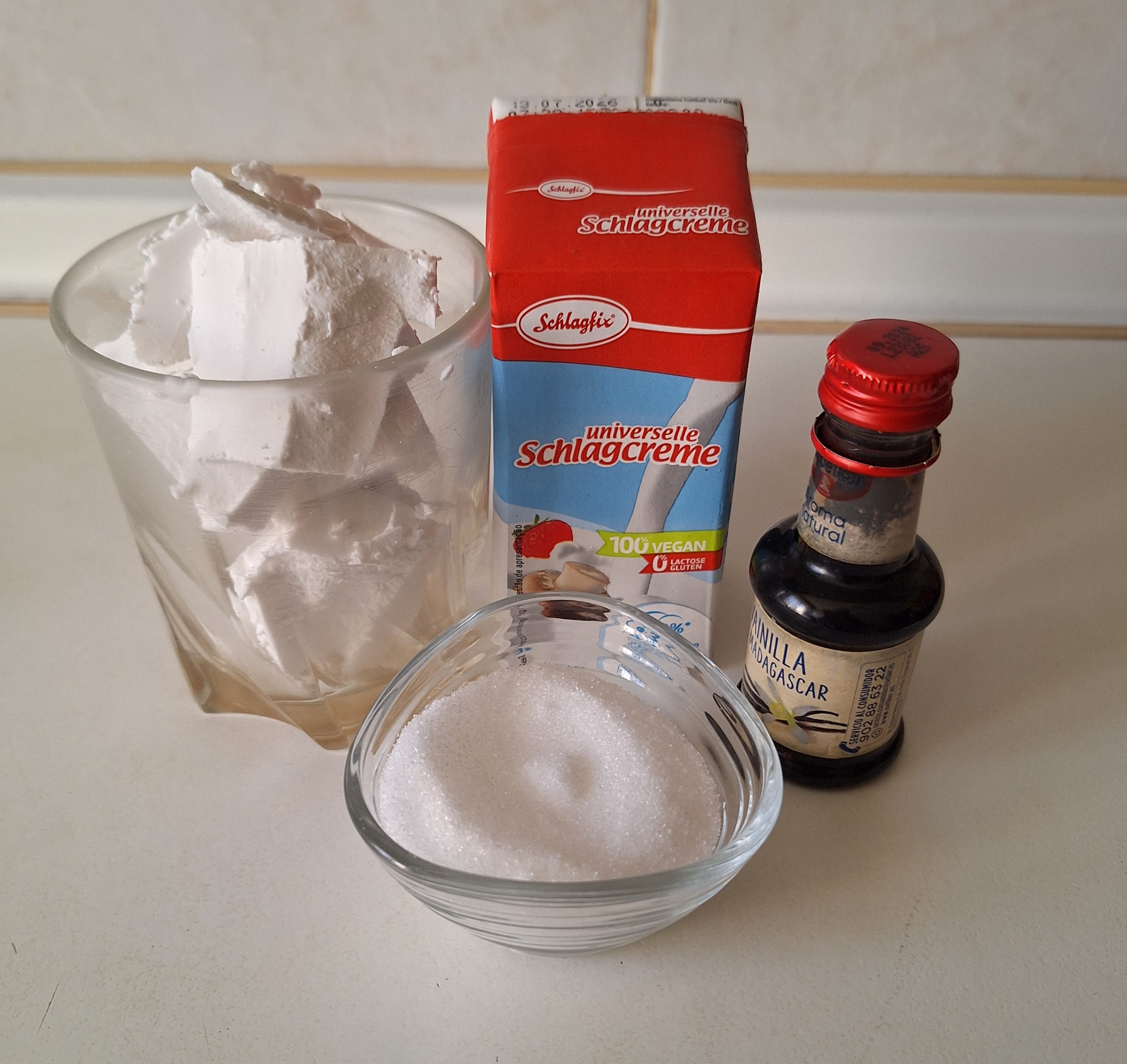 Tritura la leche de coco con la batidora para aligerar su consistencia y reserva. Monta la nata vegetal con el azúcar y la vainilla.