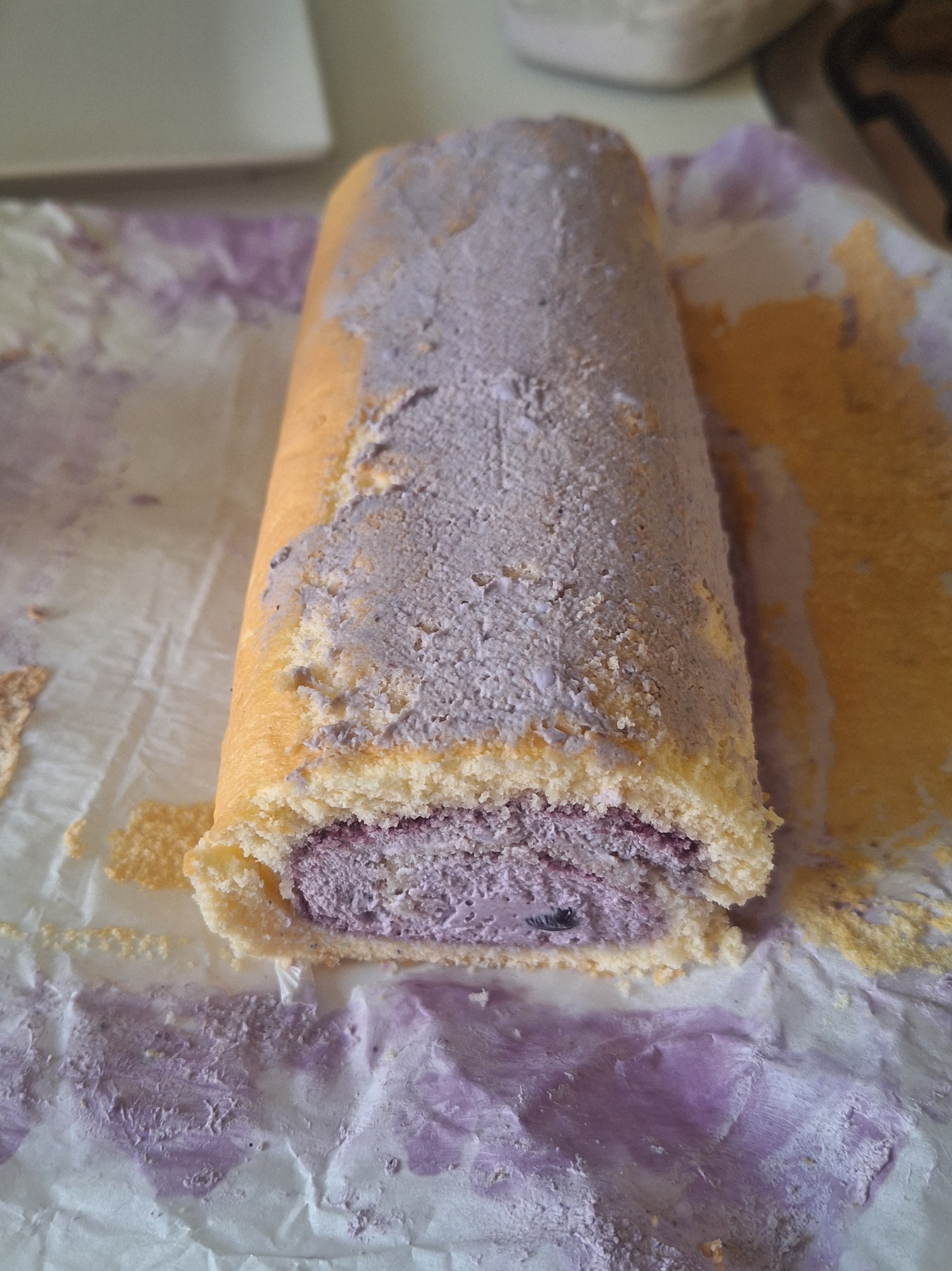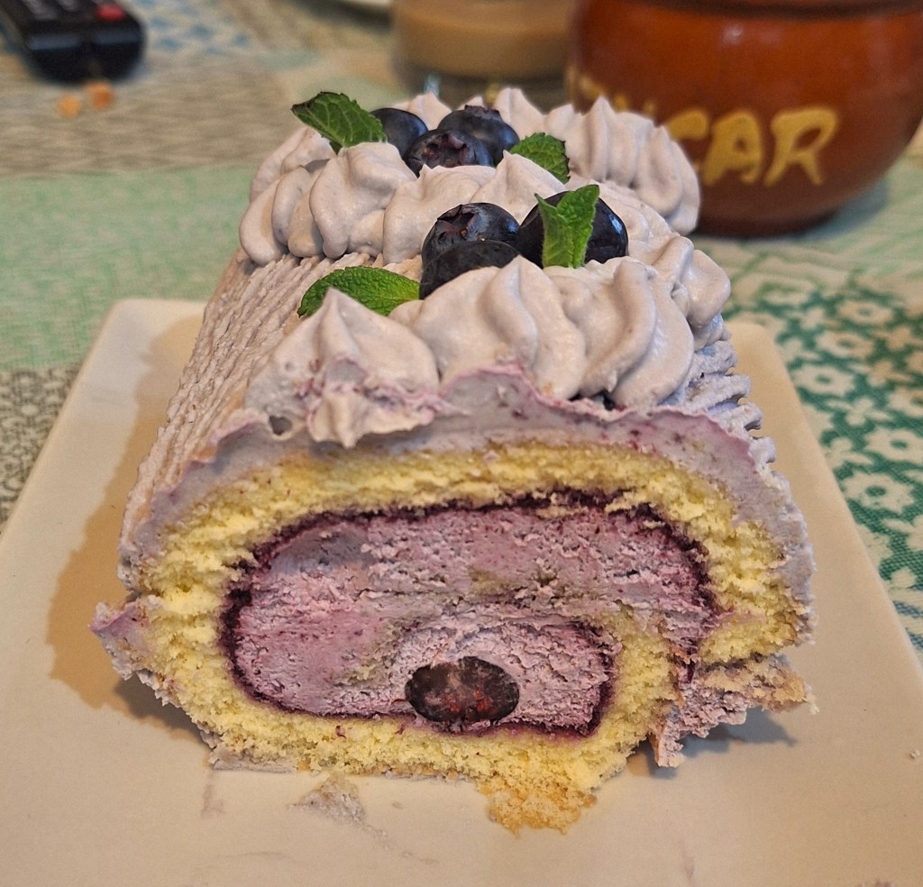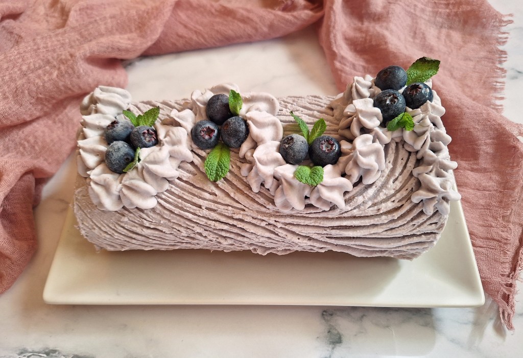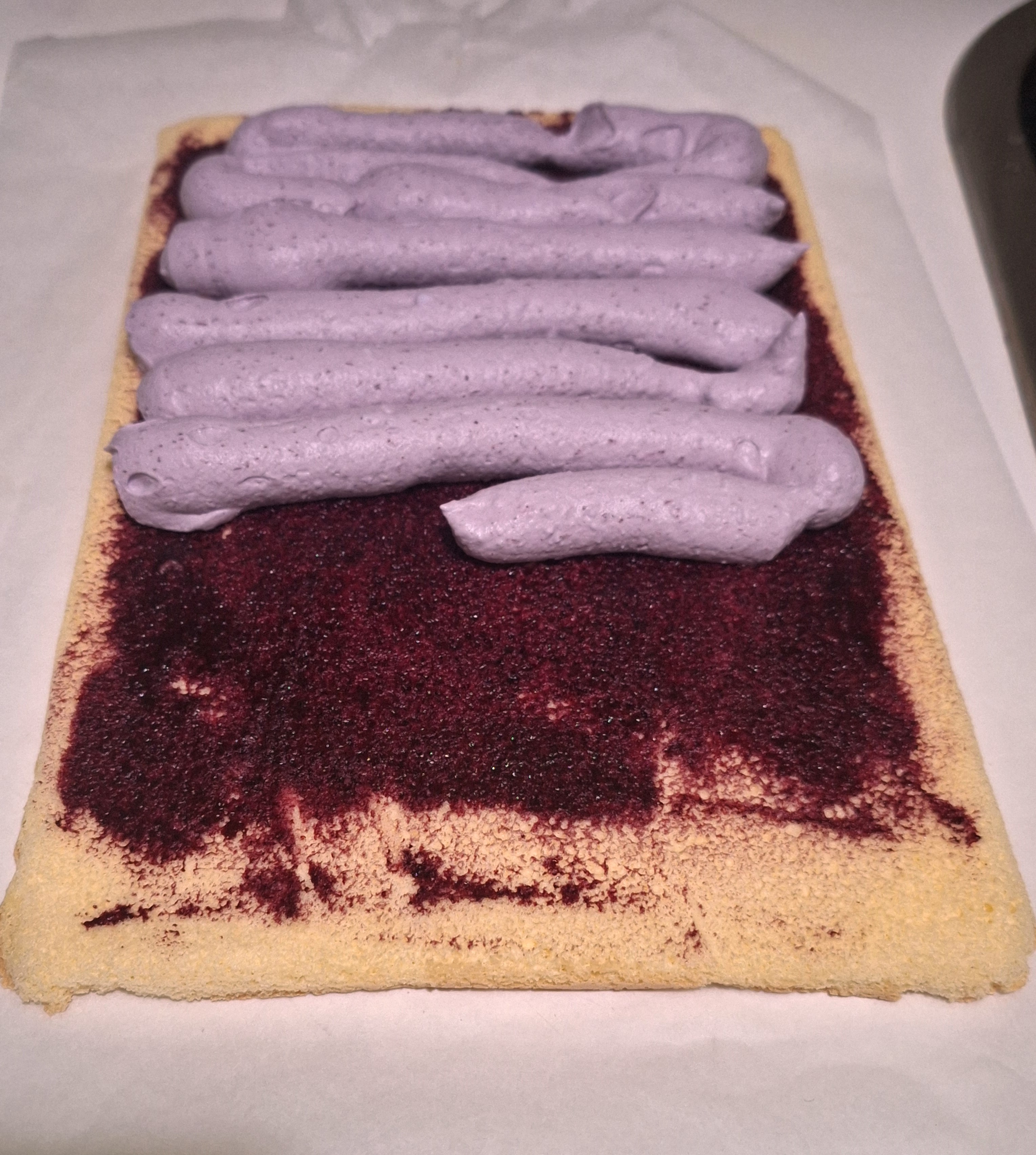 Rellena con la crema de arándanos y extiende por toda la base para que quede bien cubierta. Añade unos arándanos frescos para que al morder encuentres algún tropezón. Enrolla con cuidado, con ayuda del papel vegetal, sin presionar demasiado, pero de manera firme. Envuelve con el papel y lleva al frigo durante unas horas (yo lo dejo toda la noche para una mejor consistencia). Pasado este tiempo retira el papel y cubre con el resto de la crema de coco y arándanos.