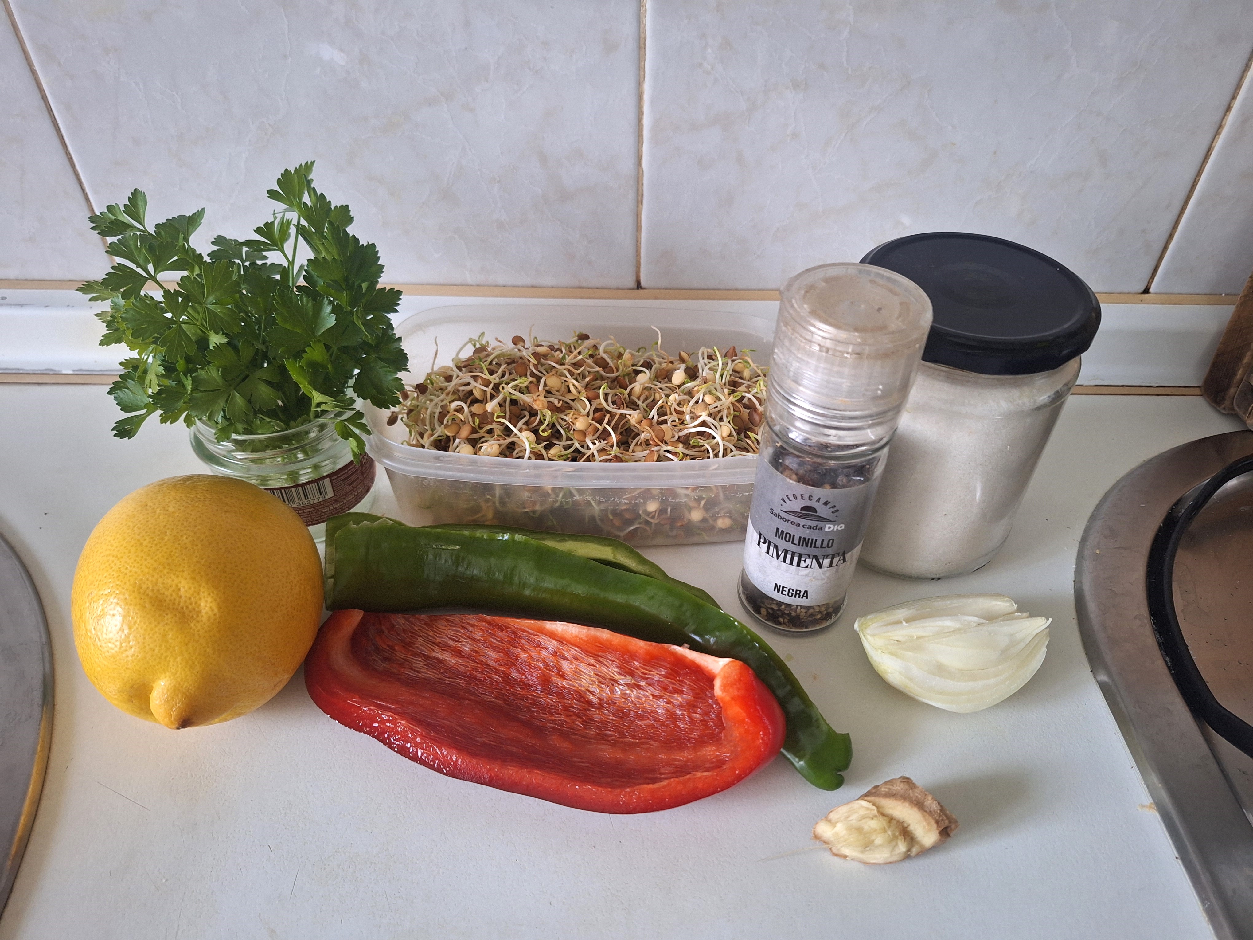 Pon las lentejas germinadas en un recipiente grande. Corta la cebolla y los pimientos en brunoise y añade a las lentejas, mezcla bien. Pela y maja el jengibre. Añade el zumo de limón, pimienta y sal y mezcla. Vierte sobre los germinados, integra y deja reposar unas horas (mejor de un día para otro), para que se tomen bien los sabores.