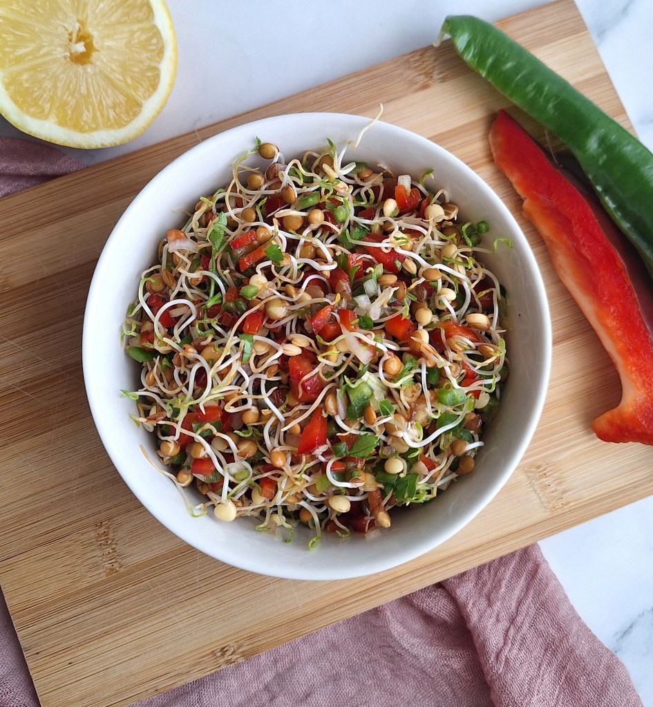 Y ahora vamos a por la receta, que es de lo más sencillo y creo que va a ser un must para este verano. Para ello me he inspirado en la receta de ceviche y he combinado los germinados con pimiento, cebolla, jengibre y zumo de limón. Dejas macerar unas horas o mejor de un día para otro y tienes un plato fresco, sabroso, nutrititvo y súper saludable. Sinceramente, me ha encantado.