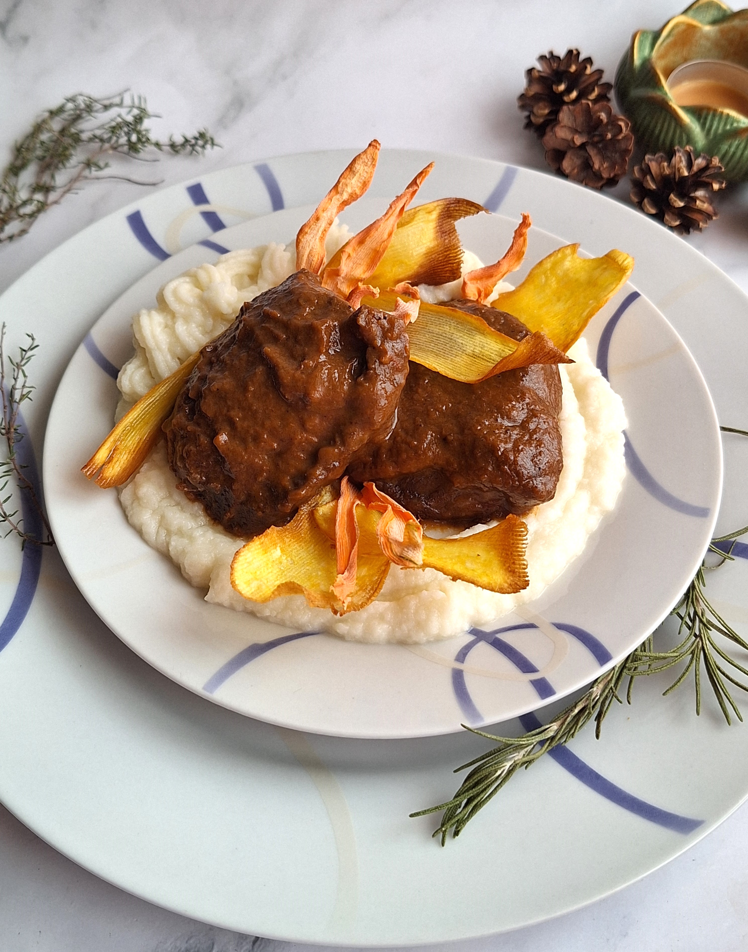 • Carrilleras con puré de coliflor y crujiente de boniato.