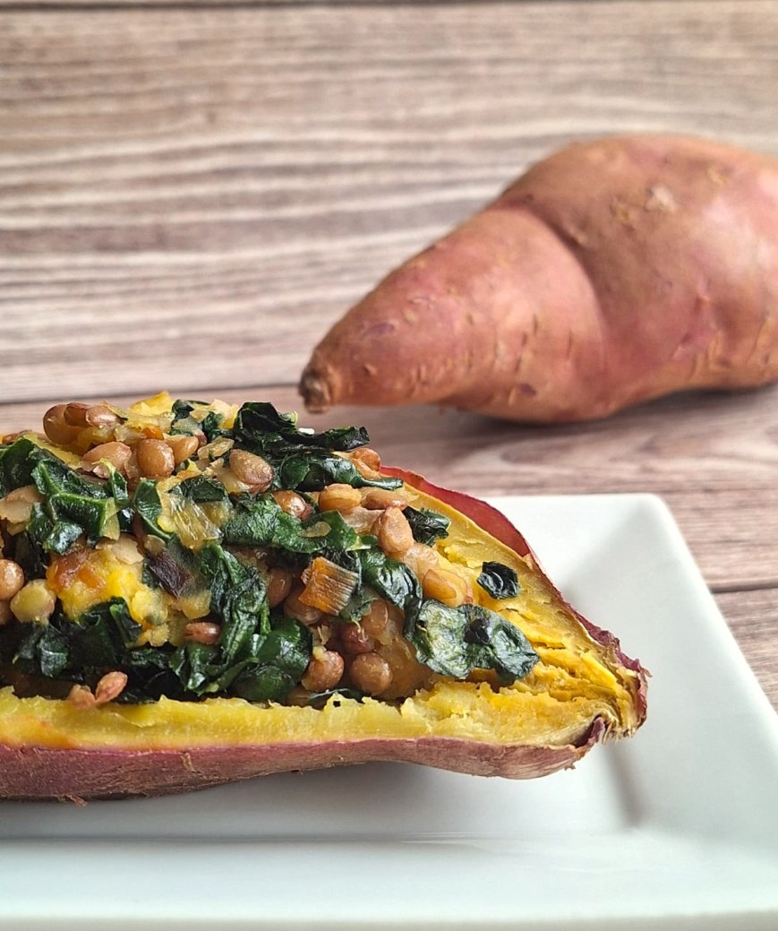 • Boniato relleno de lentejas y kale.