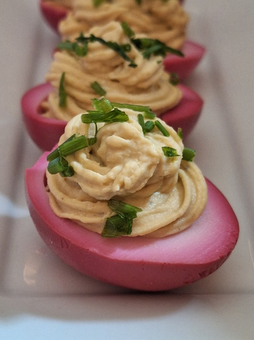 • Huevos rosas rellenos.