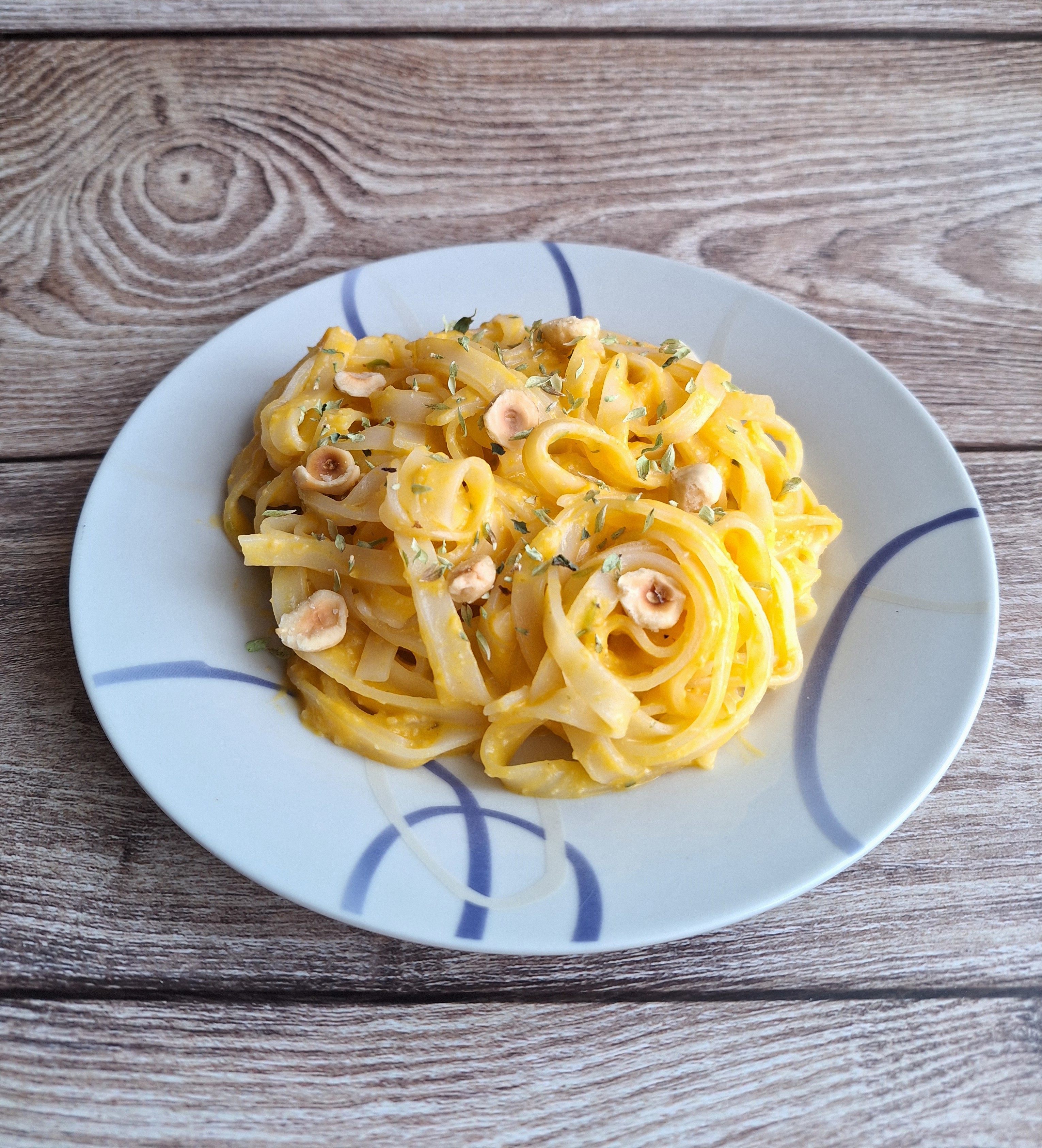 • Tallarines de arroz con salsa de calabaza y avellanas.