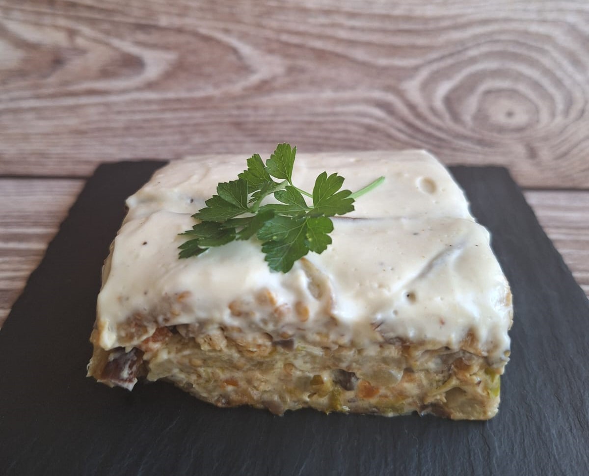 • Pastel de berenjena con guisante texturizado.