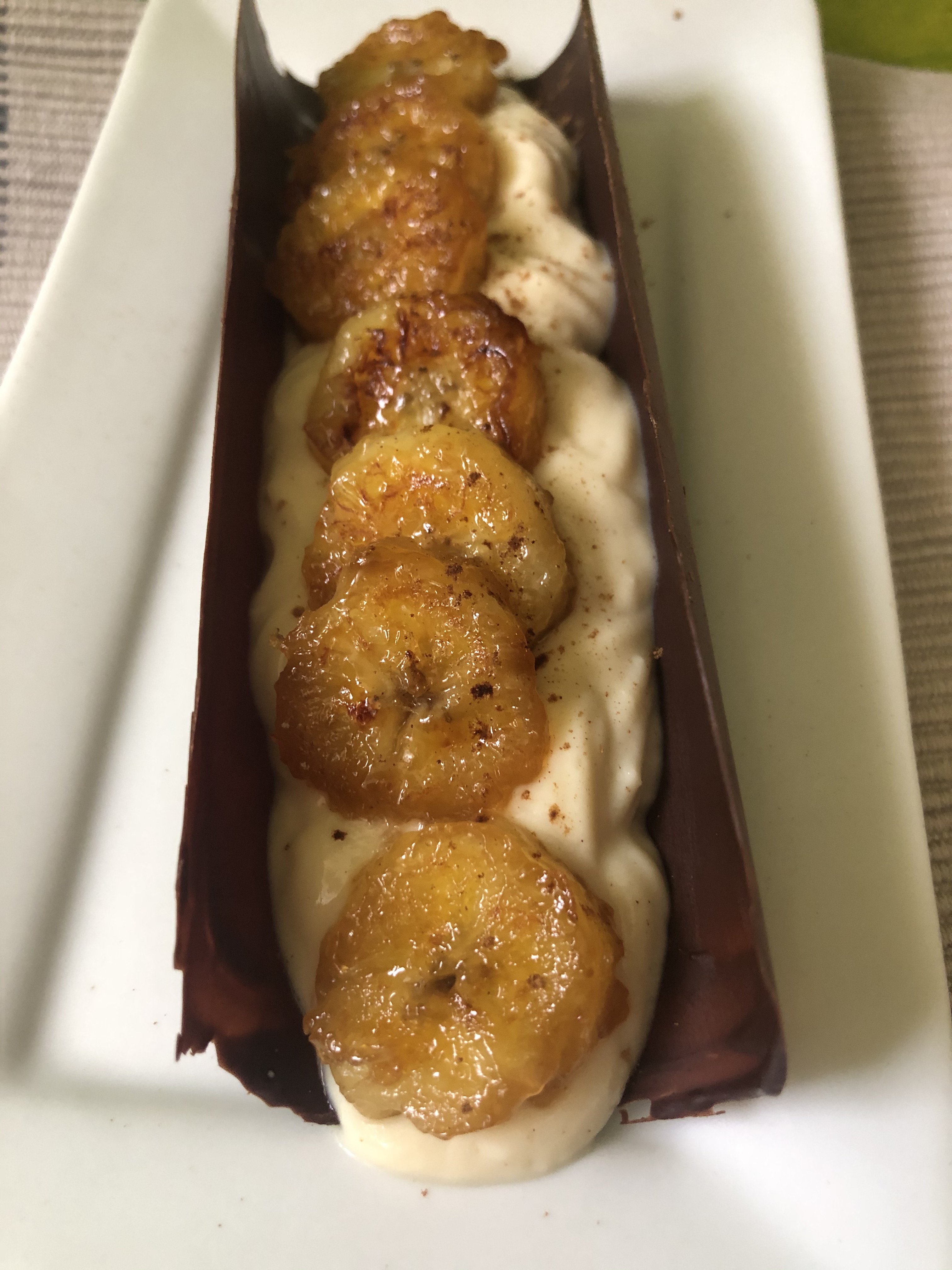• Plátano flambeado con chocolate y yogur.