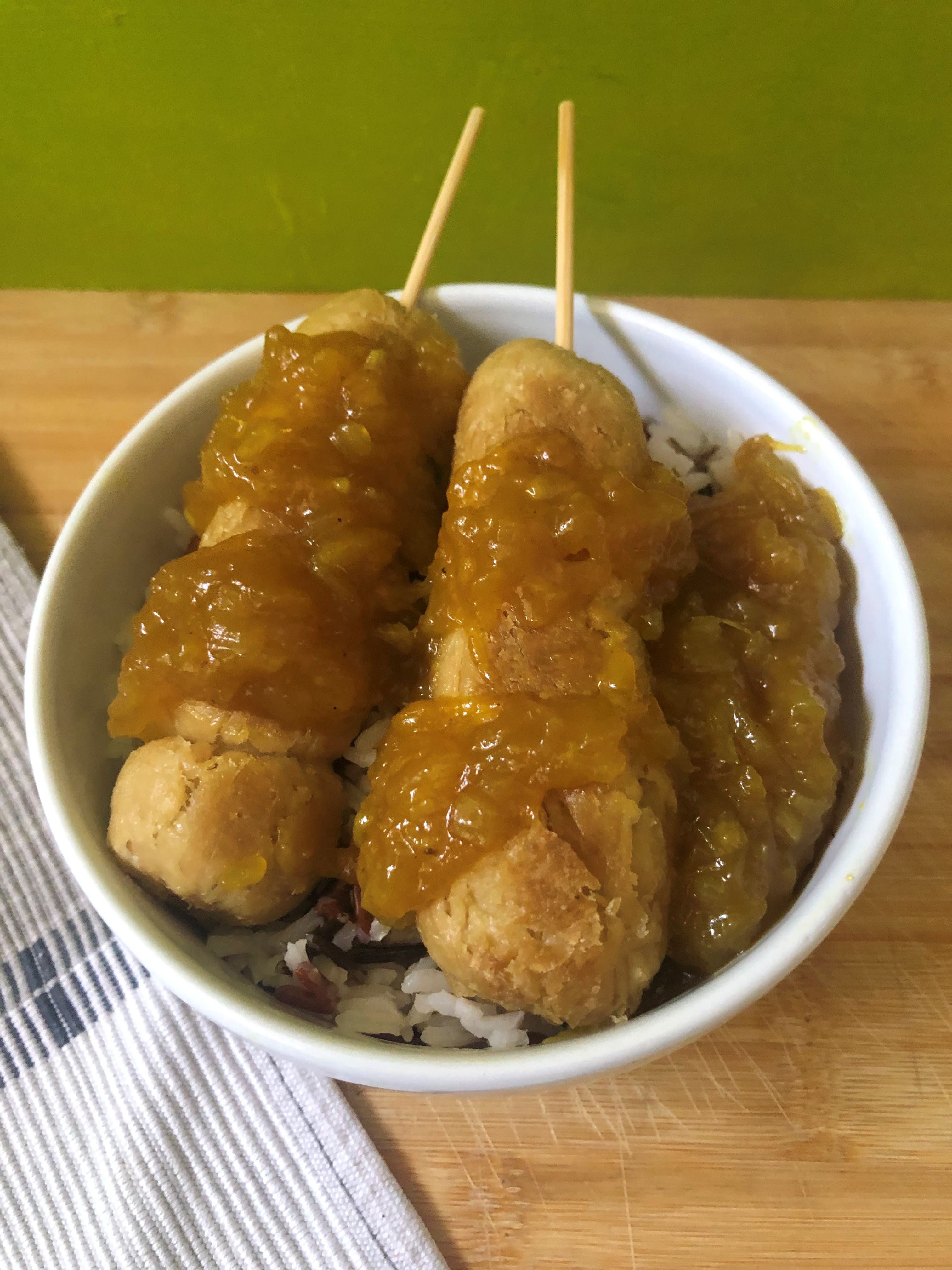 • Brochetas de yuba con chutney de mango.