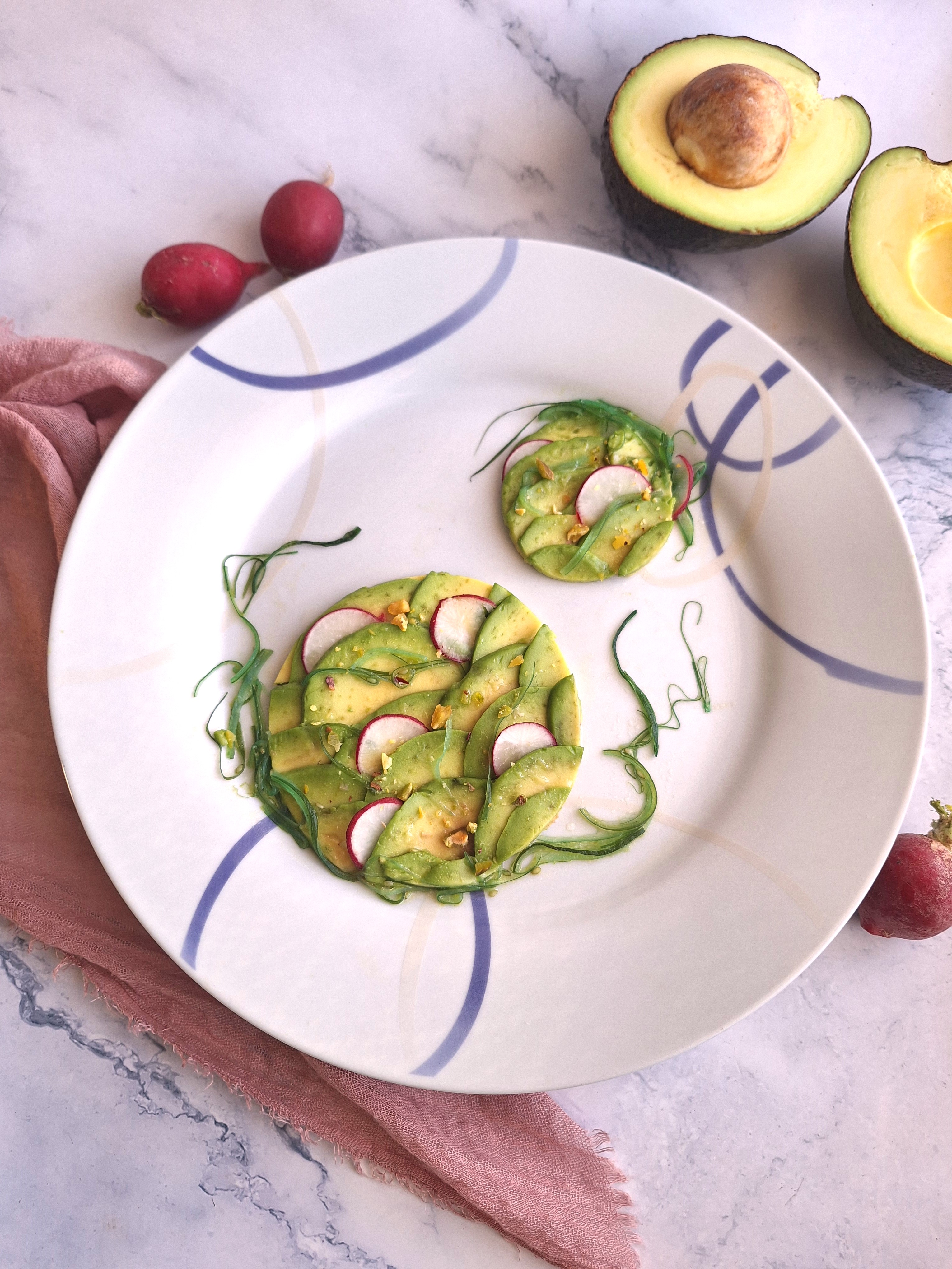 • Carpaccio de aguacate, wakame y rabanitos.