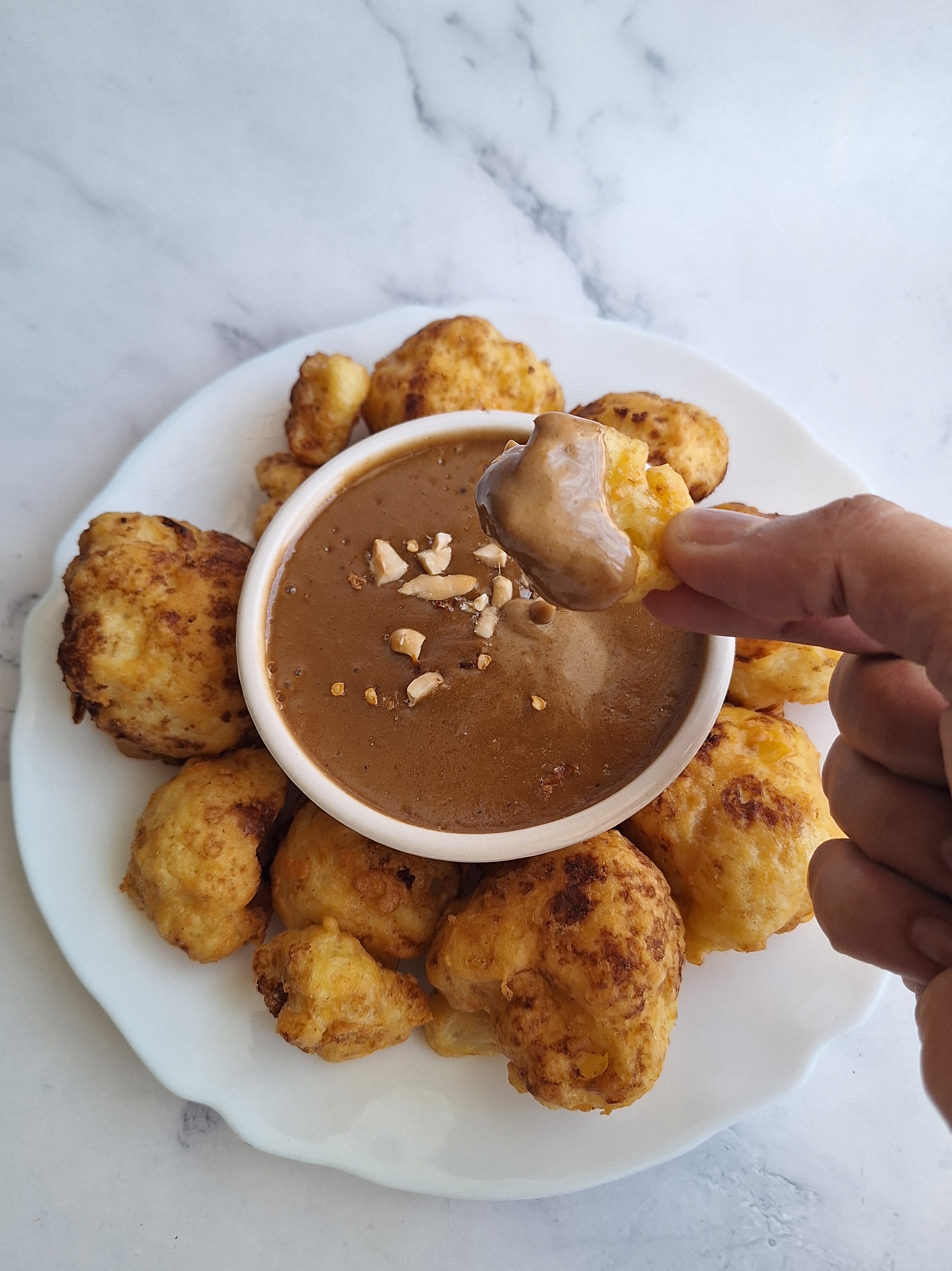 • Coliflor rebozada con salsa de cacahuete.