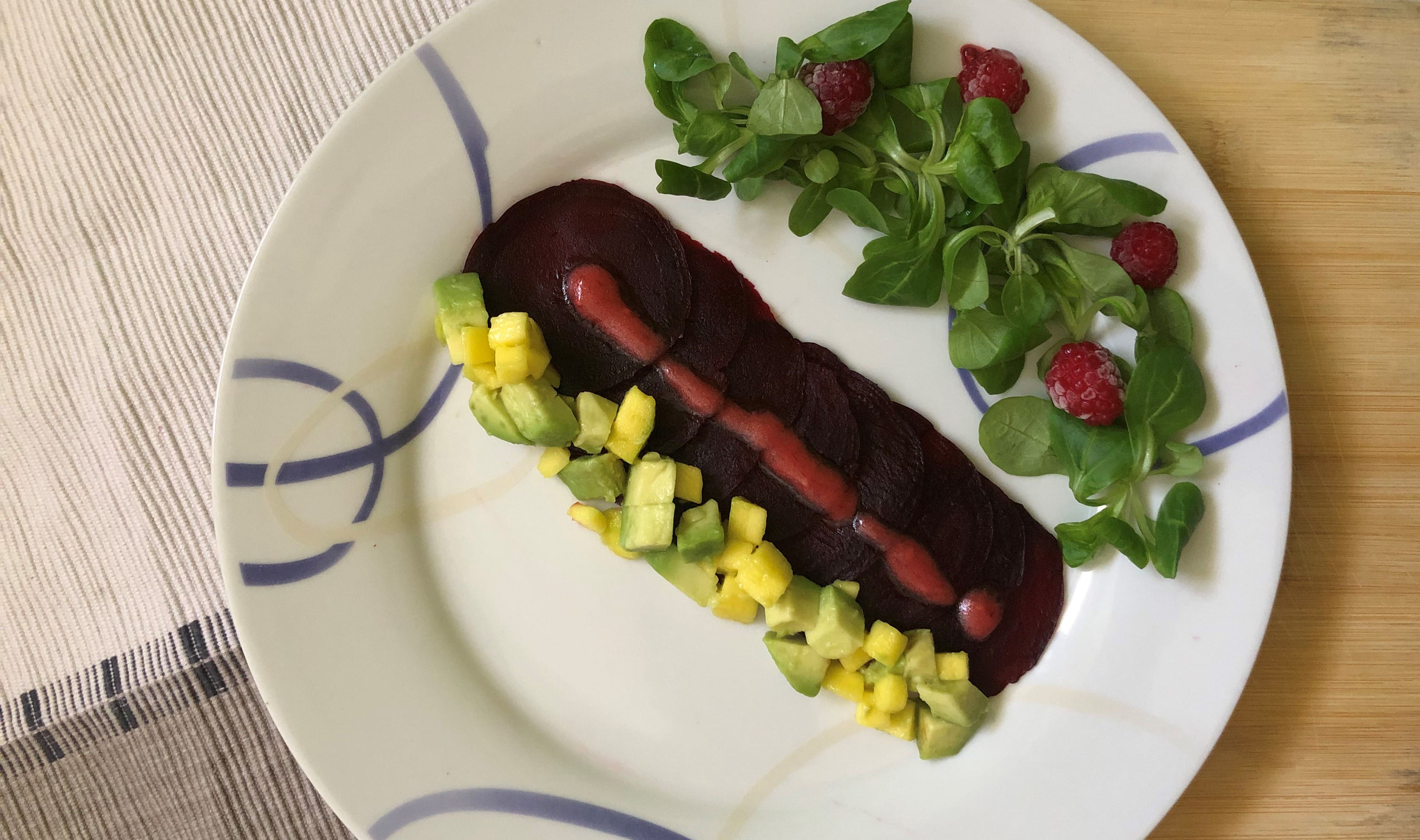 • Carpaccio de remolacha, mango y aguacate con vinagreta de frambuesas.