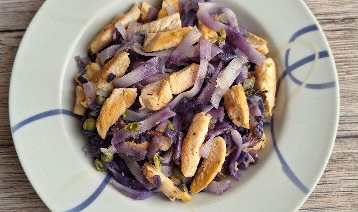 Sin gluten, baja en histamina Continúa leyendo Tallarines de arroz con pollo, lombarda y guisantes.