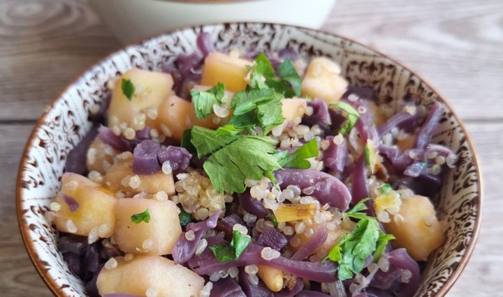 Vegana, sin gluten, frutos secos Continúa leyendo Lombarda con quinoa, manzana y piñones.