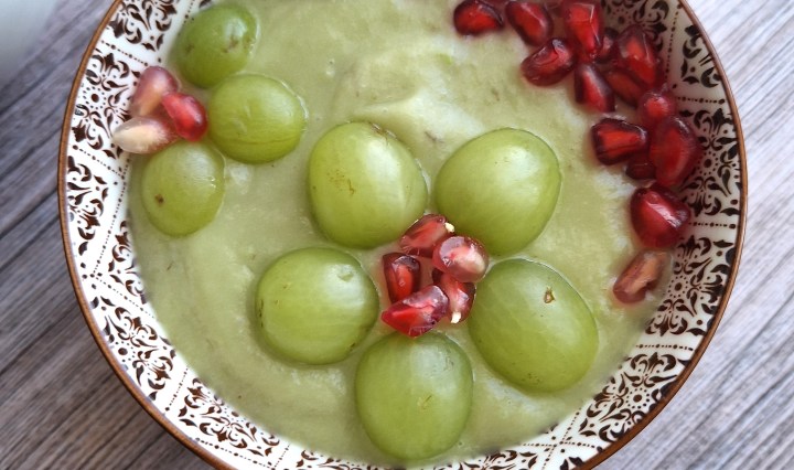 Vegano, sin gluten, sin azúcar, fruta Continúa leyendo Bowl de pera, uvas y aguacate.